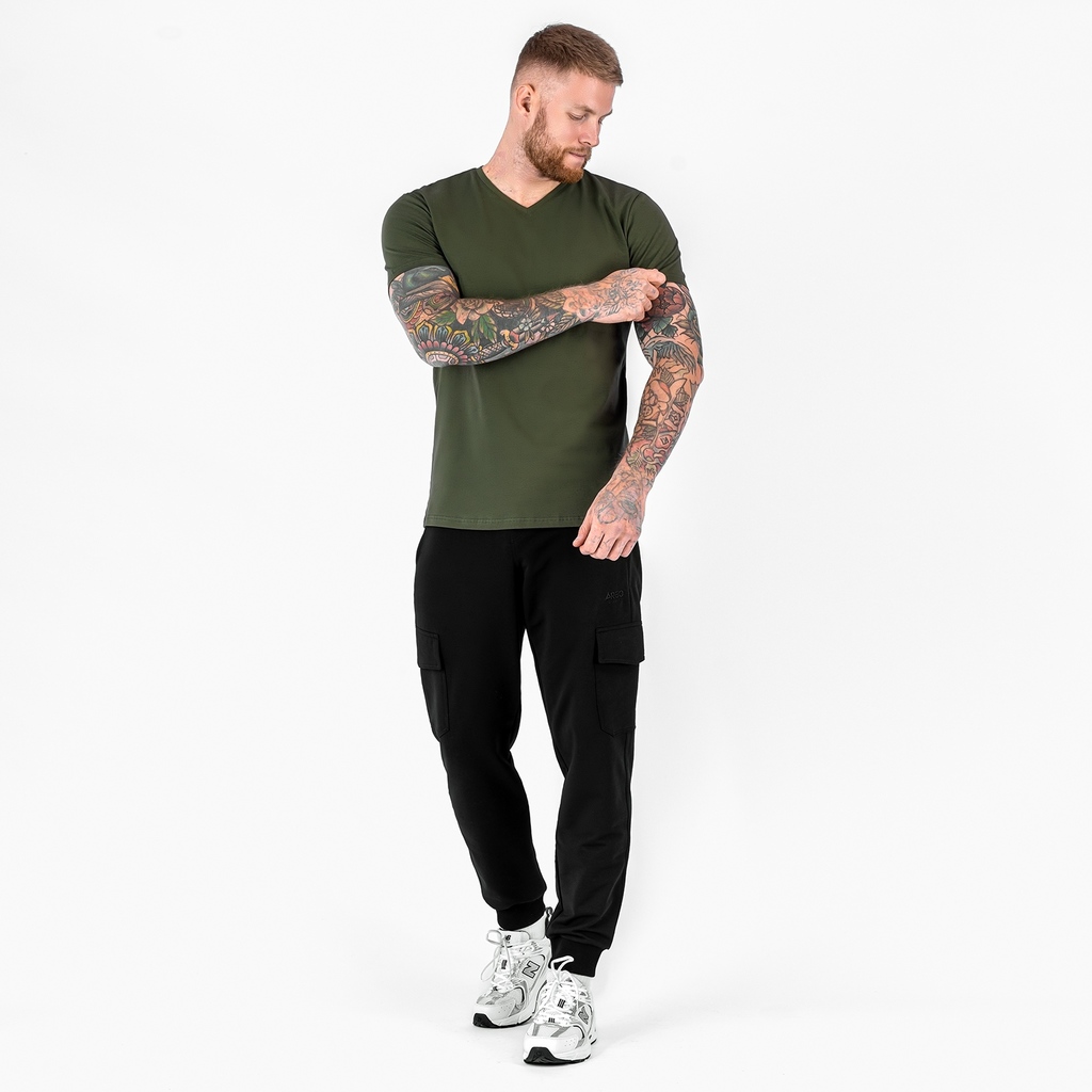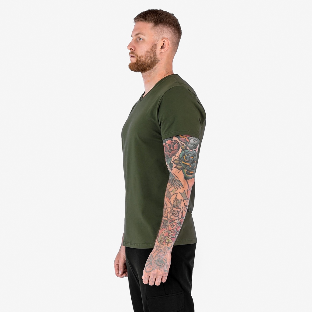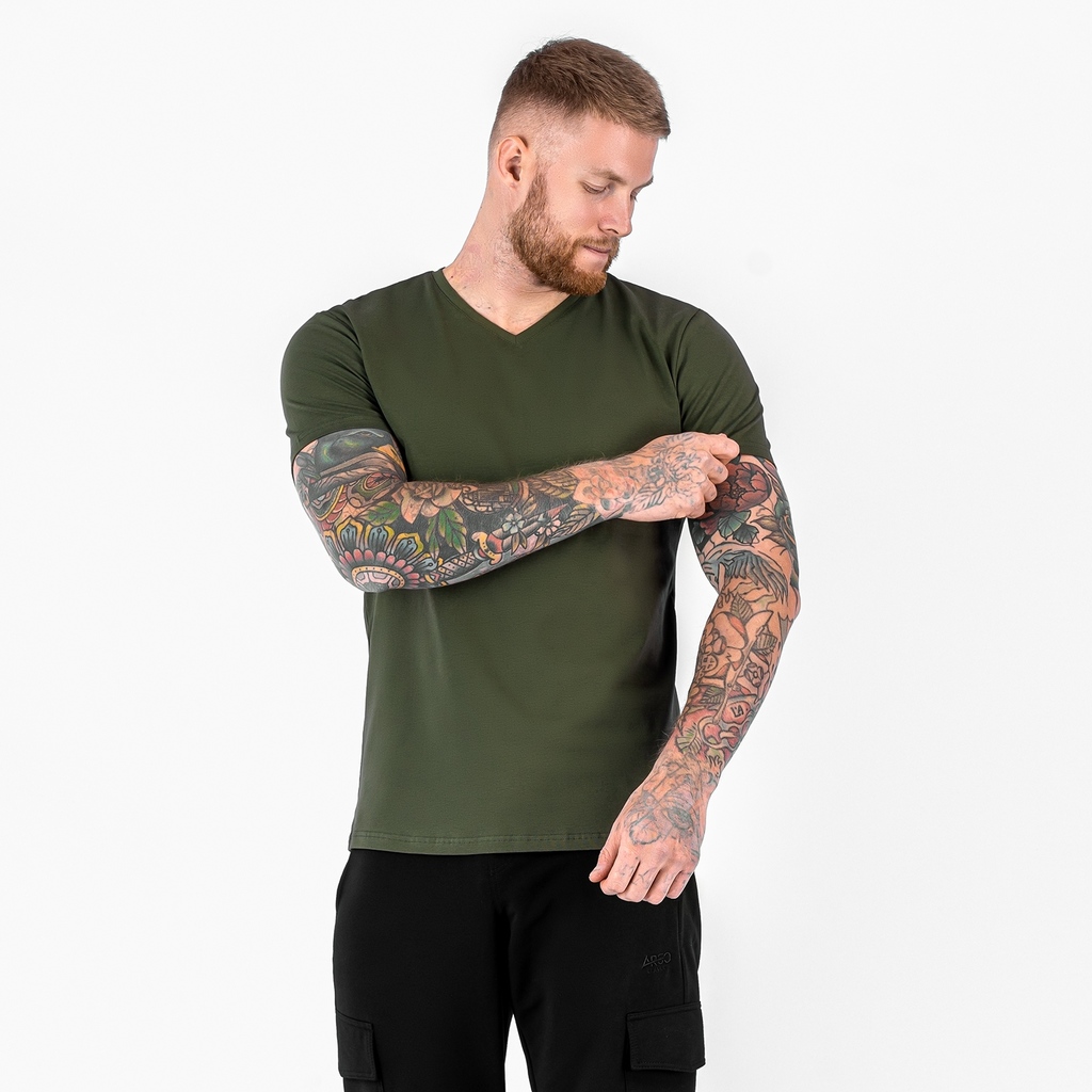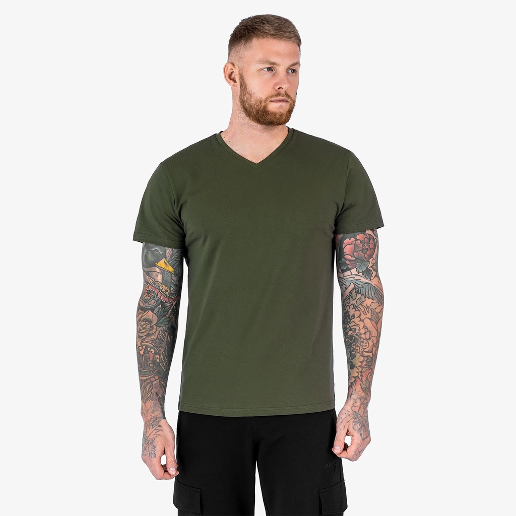 Футболка без принта с V-образным вырезом.Материал: Cotton - материал из натуральных волокон, который удобен в носке, быстро впитывает и отводит от тела влагу, хорошо пропускает воздух и не раздражает ... Показать описаниекожу. Хлопок гигиеничен, обладает устойчивостью к истиранию и разрыву, помогает балансировать температуру для избегания перегрева. В стирке требует более бережного обращения. Рекомендуется утюжить и стирать вывернутыми (особенно изделия с принтом) на изнаночную сторону при температуре 30 градусов.ВНИМАНИЕ! Оттенок цвета ткани может отличаться в зависимости от партии товара, также могут быть незначительные отличия цветовых оттенков разных деталей одного изделия. Производители ткани не считают это браком, объясняя это технологическими особенностями производства. Цветовая гамма товара может быть изменена (в рамках допуска) производителем трикотажных полотен в зависимости от серии поставки без предварительного уведомления.В связи с этим, подбор комплекта одежды в одном оттенке возможен только в процессе формирования единого заказа.Состав: 92% Cotton, 8% Elastane
