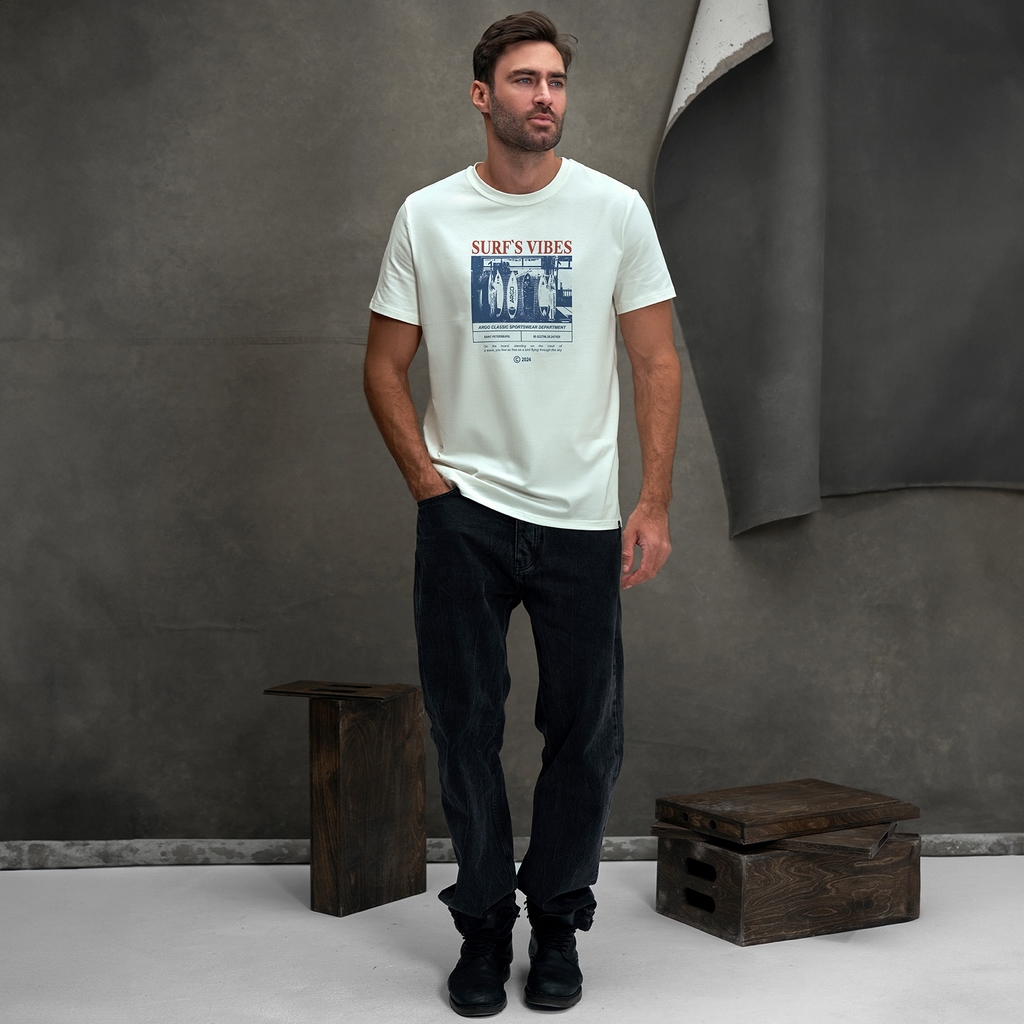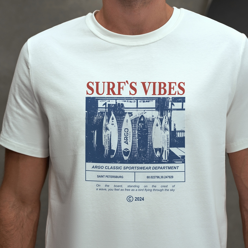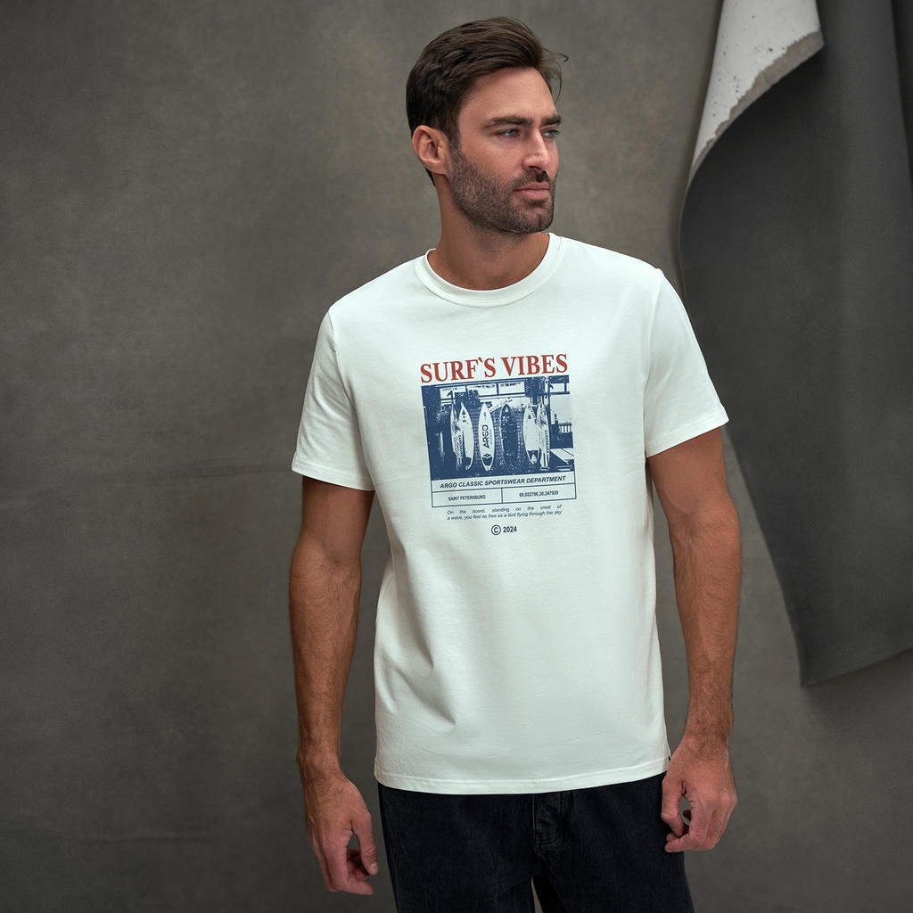 Мужская футболка с круглым вырезом горловины (принт "Surf's Vibes").Материал: Cotton - материал из натуральных волокон, который удобен в носке, быстро впитывает и отводит от тела влагу, хорошо пропуск... Показать описаниеает воздух и не раздражает кожу. Хлопок гигиеничен, обладает устойчивостью к истиранию и разрыву, помогает балансировать температуру для избегания перегрева. В стирке требует более бережного обращения. Рекомендуется утюжить и стирать вывернутыми (особенно изделия с принтом) на изнаночную сторону при температуре 30 градусов.ВНИМАНИЕ! Оттенок цвета ткани может отличаться в зависимости от партии товара, также могут быть незначительные отличия цветовых оттенков разных деталей одного изделия. Производители ткани не считают это браком, объясняя это технологическими особенностями производства. Цветовая гамма товара может быть изменена (в рамках допуска) производителем трикотажных полотен в зависимости от серии поставки без предварительного уведомления.В связи с этим, подбор комплекта одежды в одном оттенке возможен только в процессе формирования единого заказа.Состав: 92% Cotton, 8% Elastane
