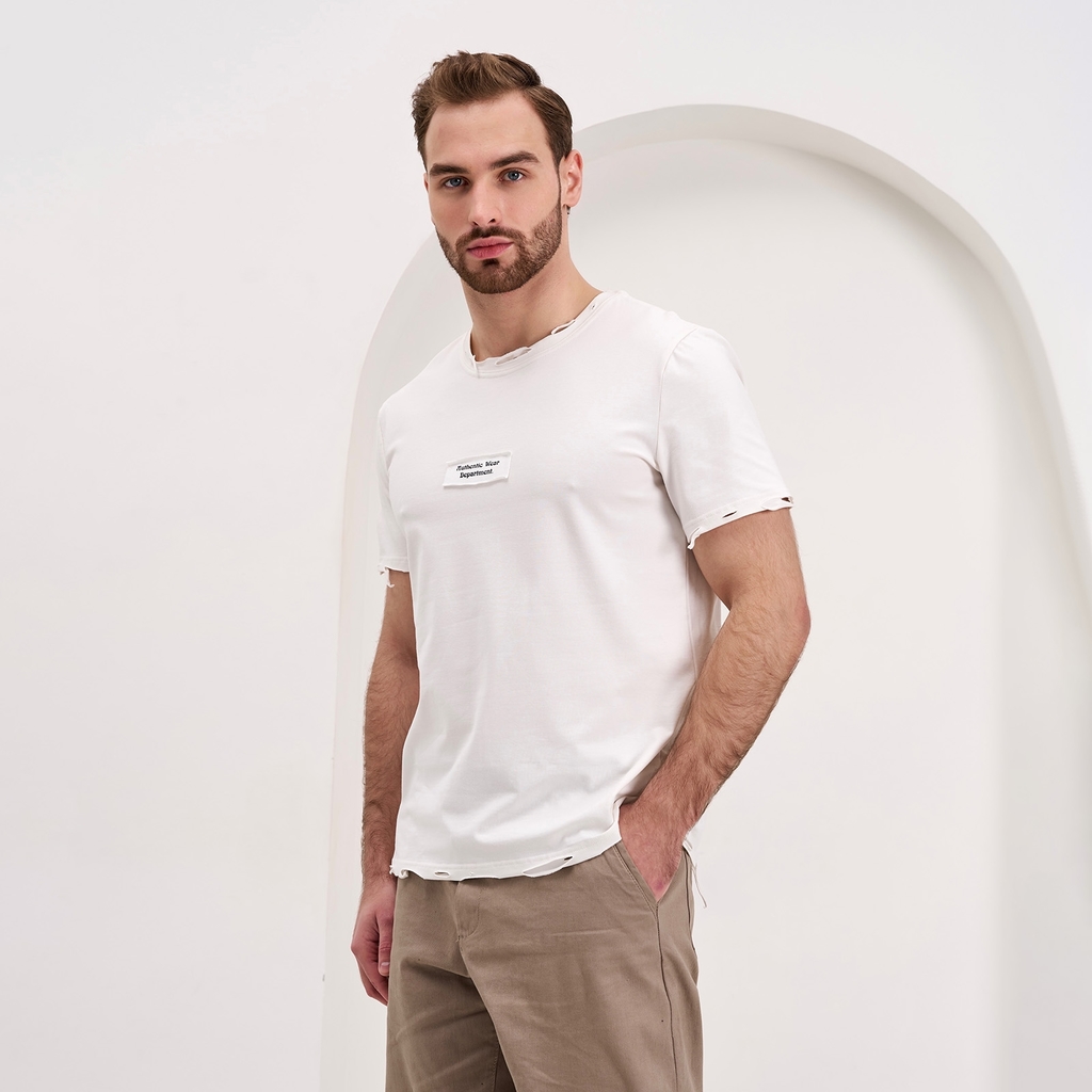 Мужская футболка с рваными краями (нашивка и термо "Authentic Wear Derartment").Материал: Cotton - материал из натуральных волокон, который удобен в носке, быстро впитывает и отводит от тела влагу, хо... Показать описаниерошо пропускает воздух и не раздражает кожу. Хлопок гигиеничен, обладает устойчивостью к истиранию и разрыву, помогает балансировать температуру для избегания перегрева. В стирке требует более бережного обращения. Рекомендуется утюжить и стирать вывернутыми (особенно изделия с принтом) на изнаночную сторону при температуре 30 градусов.ВНИМАНИЕ! Оттенок цвета ткани может отличаться в зависимости от партии товара, также могут быть незначительные отличия цветовых оттенков разных деталей одного изделия. Производители ткани не считают это браком, объясняя это технологическими особенностями производства. Цветовая гамма товара может быть изменена (в рамках допуска) производителем трикотажных полотен в зависимости от серии поставки без предварительного уведомления.В связи с этим, подбор комплекта одежды в одном оттенке возможен только в процессе формирования единого заказа.Состав: 92% Cotton, 8% Elastane