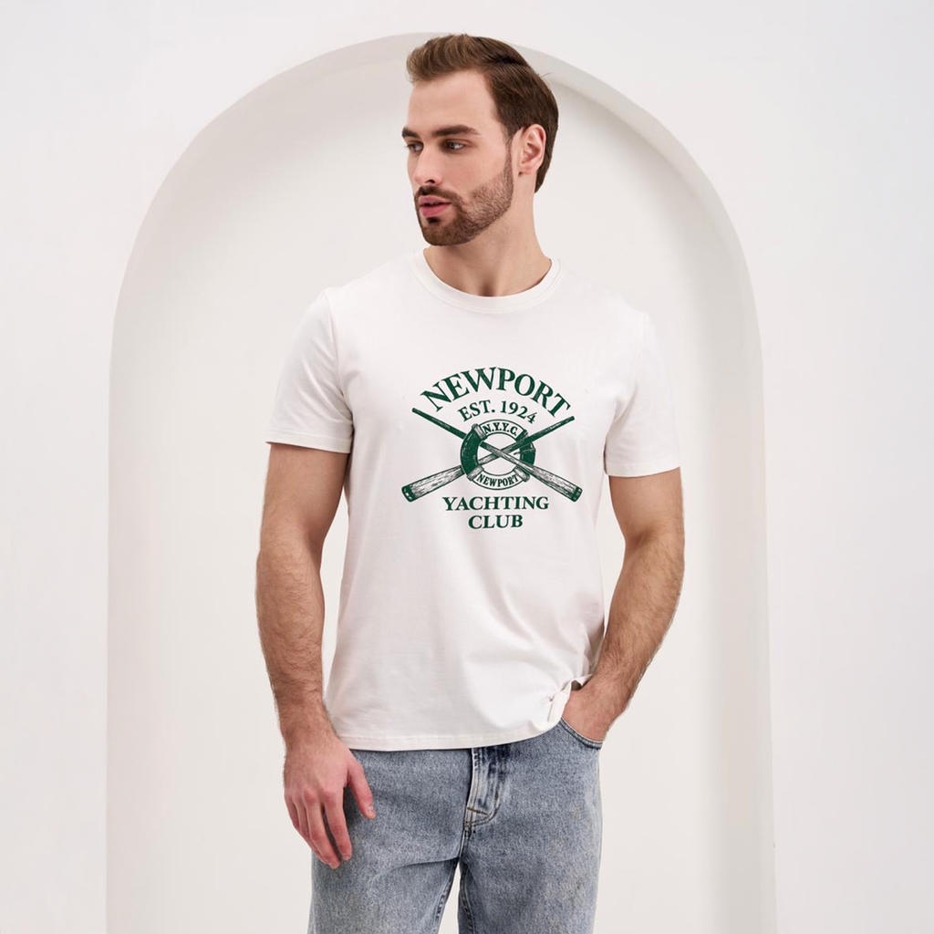 Мужская футболка с круглым вырезом горловины (принт "Newport Yachting Club").Материал: Cotton - материал из натуральных волокон, который удобен в носке, быстро впитывает и отводит от тела влагу, хорош... Показать описаниео пропускает воздух и не раздражает кожу. Хлопок гигиеничен, обладает устойчивостью к истиранию и разрыву, помогает балансировать температуру для избегания перегрева. В стирке требует более бережного обращения. Рекомендуется утюжить и стирать вывернутыми (особенно изделия с принтом) на изнаночную сторону при температуре 30 градусов.ВНИМАНИЕ! Оттенок цвета ткани может отличаться в зависимости от партии товара, также могут быть незначительные отличия цветовых оттенков разных деталей одного изделия. Производители ткани не считают это браком, объясняя это технологическими особенностями производства. Цветовая гамма товара может быть изменена (в рамках допуска) производителем трикотажных полотен в зависимости от серии поставки без предварительного уведомления.В связи с этим, подбор комплекта одежды в одном оттенке возможен только в процессе формирования единого заказа.Состав: 92% Cotton, 8% Elastane