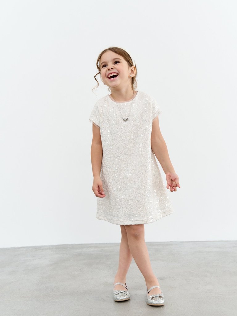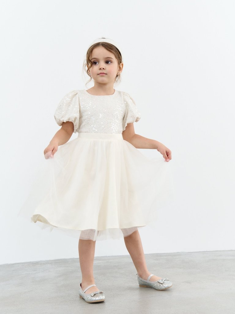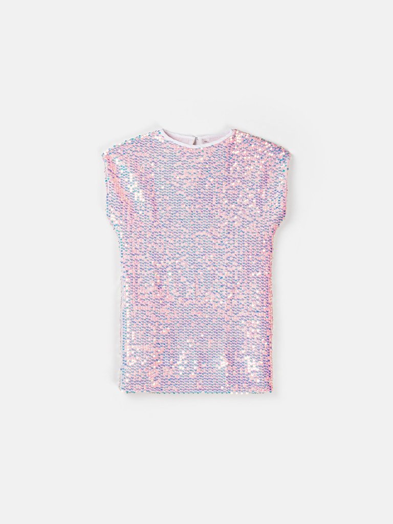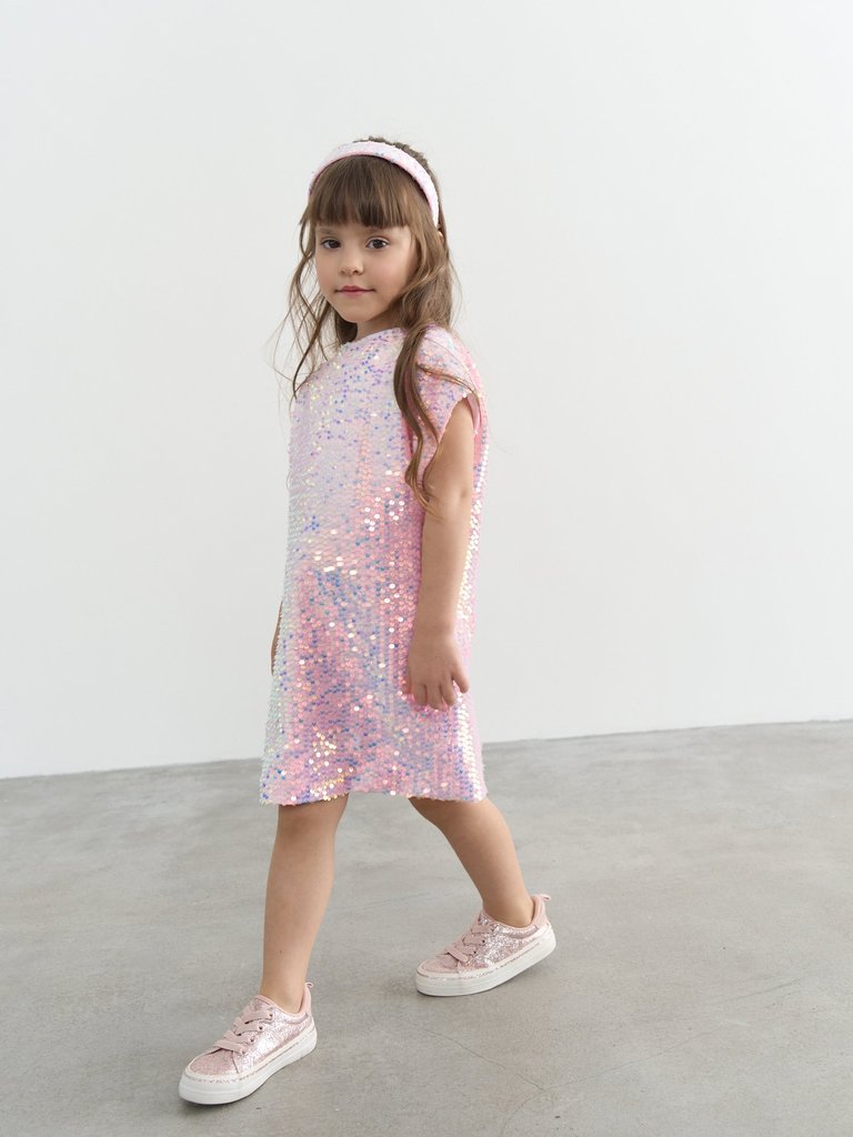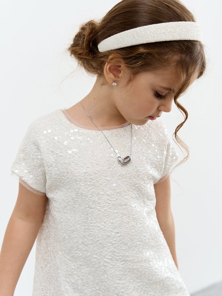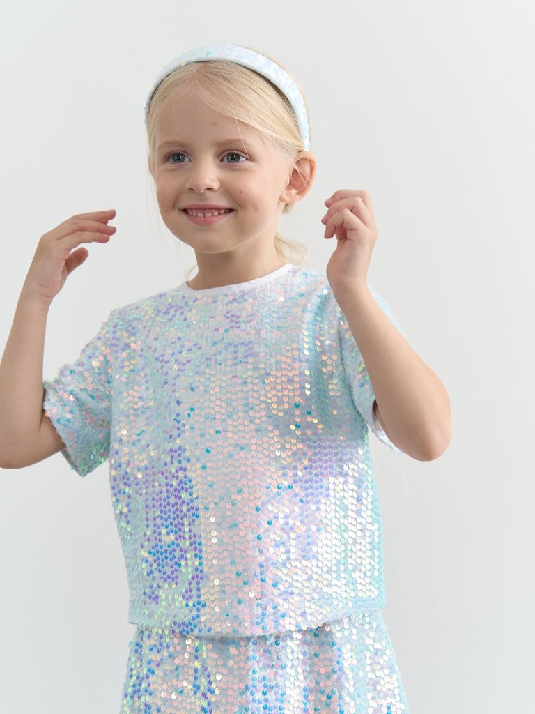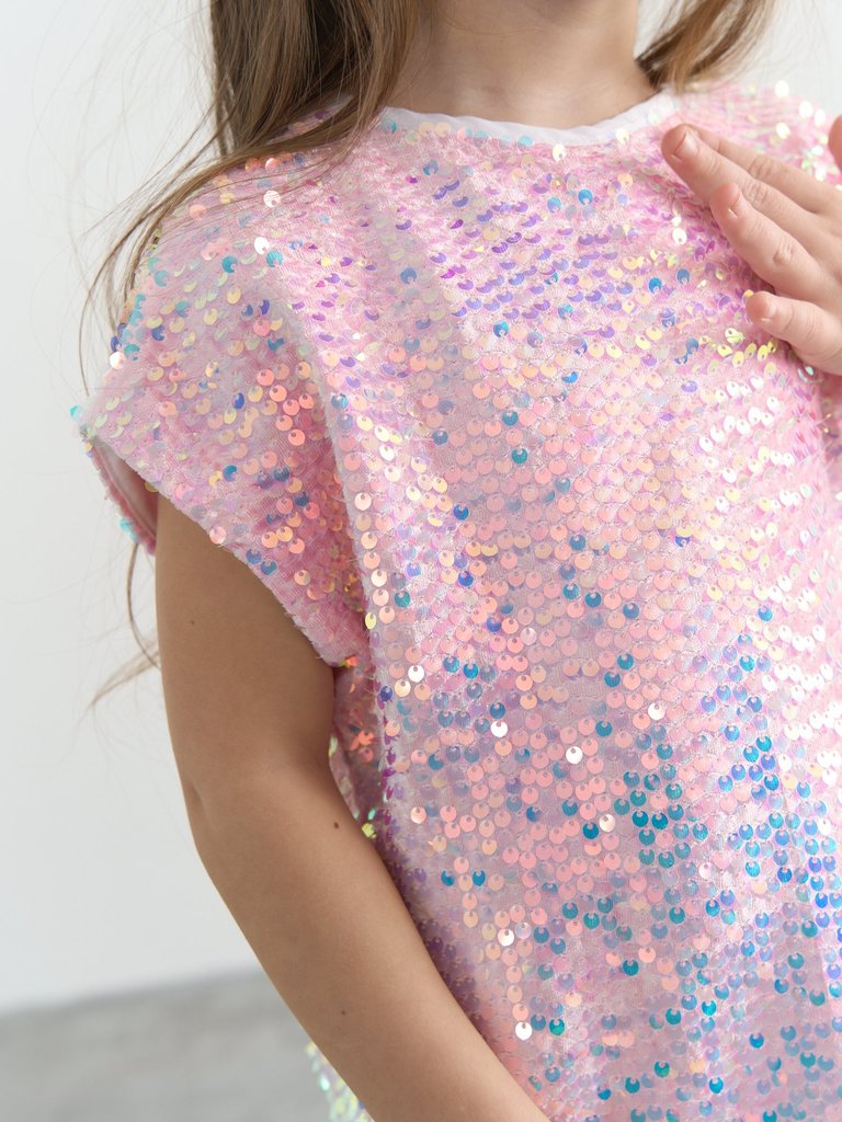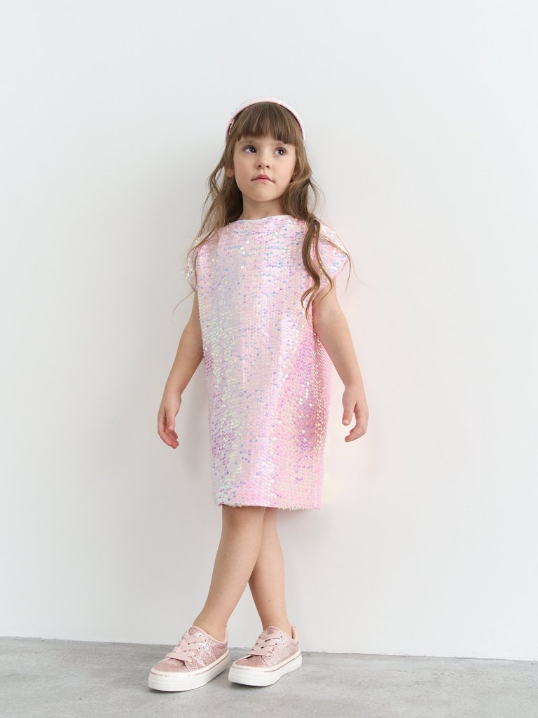 Платье для сияющих образов! Свободный силуэт для комфорта движений. Сверху тонкая трикотажная сетка с нашитыми пайетками, изнутри — гладкая, приятная к телу подкладка. Горловина, рукава и низ обтачены... Показать описание подкладочной тканью, поэтому пайетки не натрут нежную детскую кожу. Застежка на пуговицу сзади. Ткань Верх - трикотаж; подкладка - ниагара Состав Верх - 95% полиэстер, 5% эластан; подкладка - 97% полиэстер, 3% спандекс Уход Ручная или деликатная стирка при температуре не выше 30 °C. Страна производства: Россия