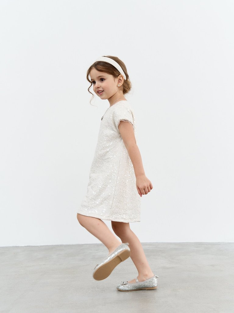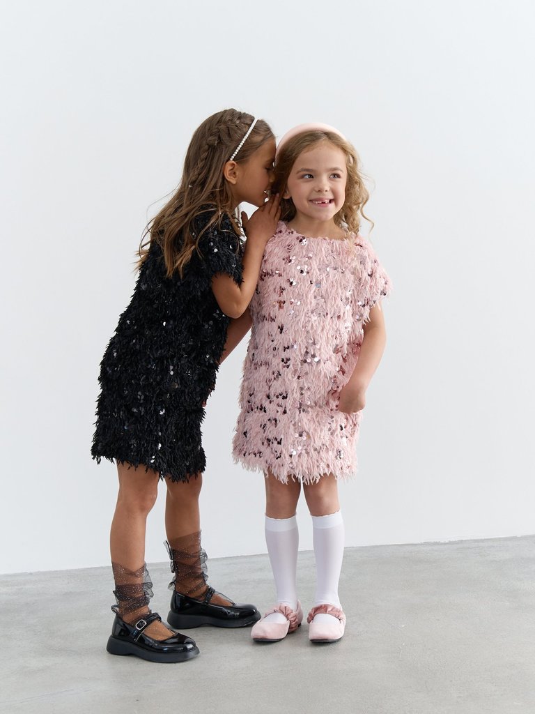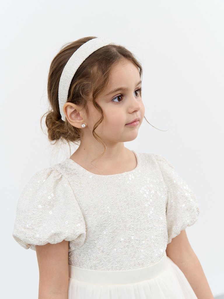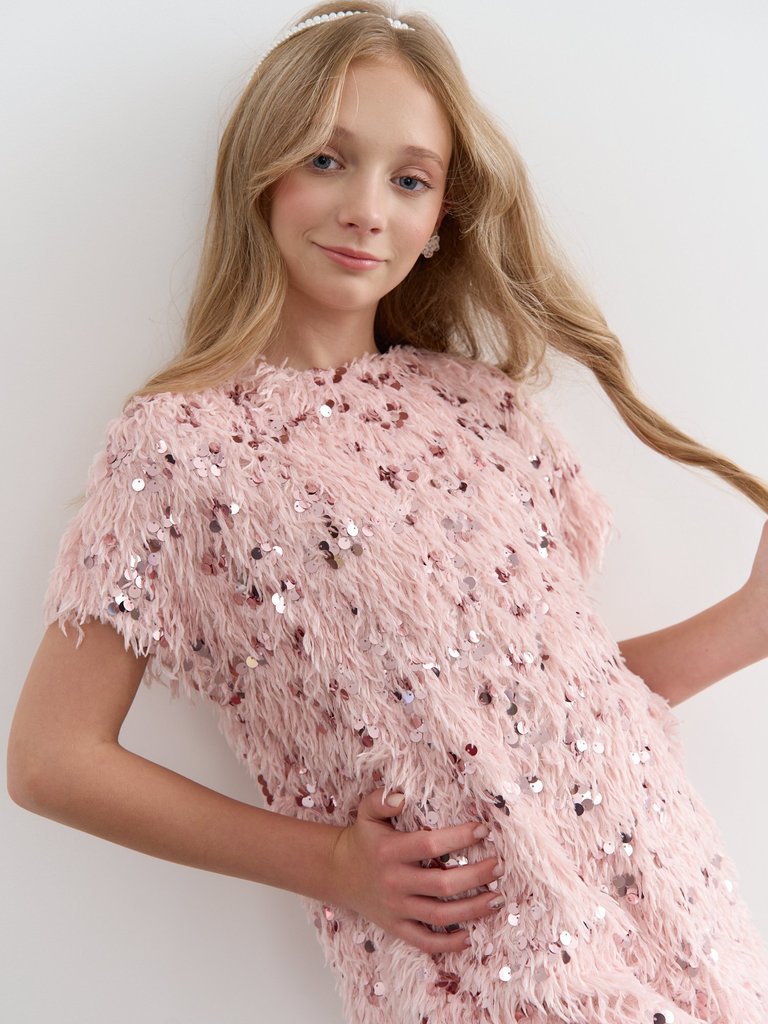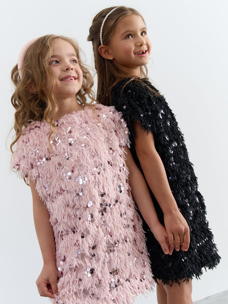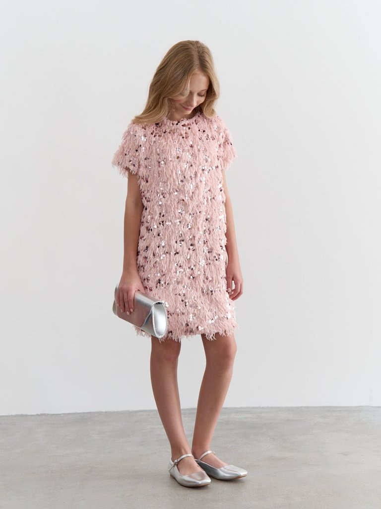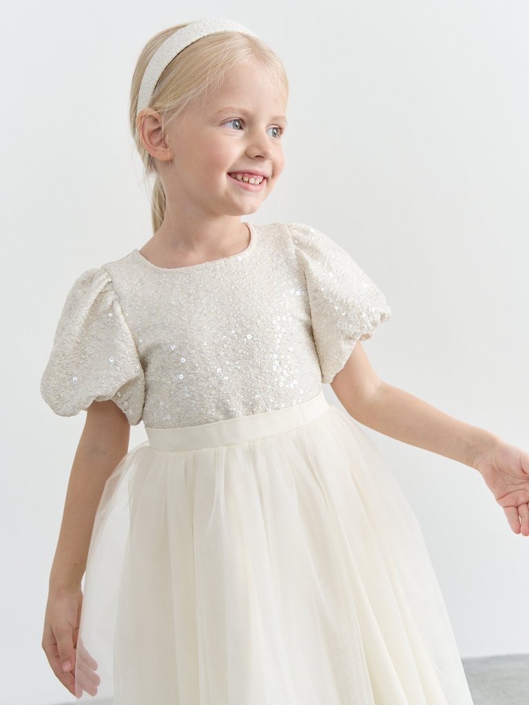 Платье для сияющих образов! Свободный силуэт для комфорта движений. Сверху тонкая трикотажная сетка с нашитыми пайетками, изнутри — гладкая, приятная к телу подкладка. Горловина, рукава и низ обтачены... Показать описание подкладочной тканью, поэтому пайетки не натрут нежную детскую кожу. Застежка на пуговицу сзади. Ткань Верх - трикотаж; подкладка - ниагара Состав Верх - 95% полиэстер, 5% эластан; подкладка - 97% полиэстер, 3% спандекс Уход Ручная или деликатная стирка при температуре не выше 30 °C. Страна производства: Россия
