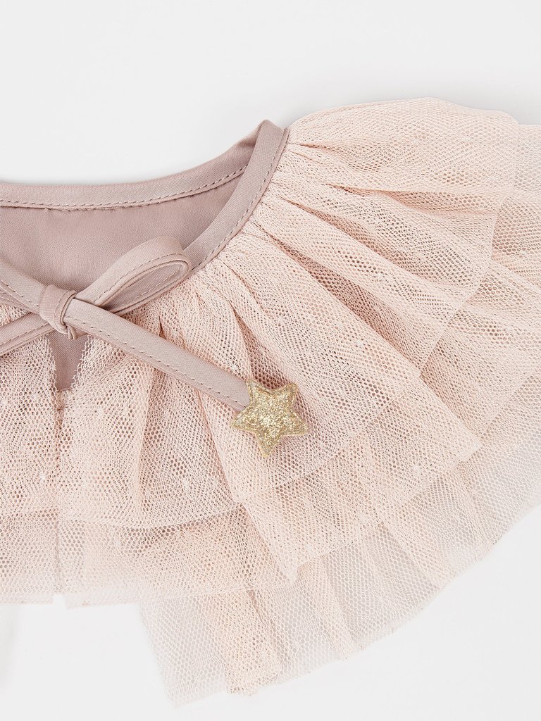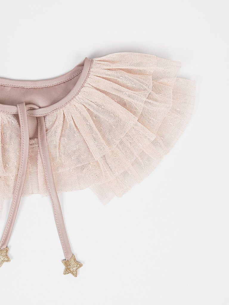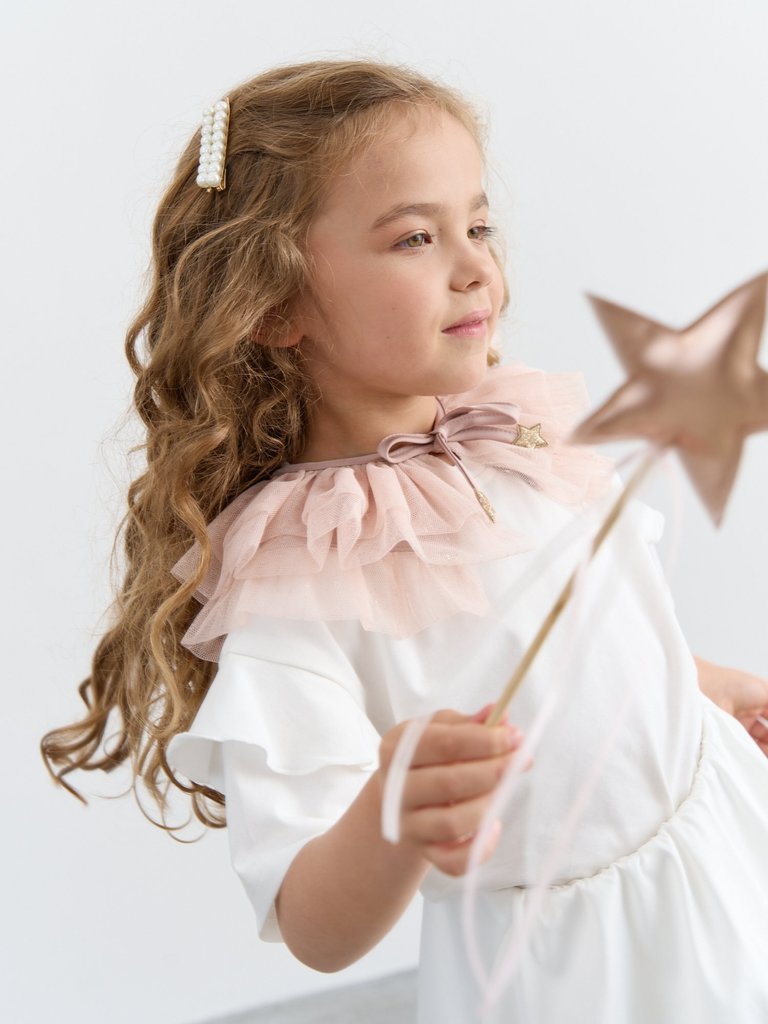 Последний штрих для образа маленькой принцессы! Воротник из фатина отлично сочетается с платьями и блузками. Окантовка переходит в завязки с звездочками на концах. Ткань Верх - фатин; отделка - атлас ... Показать описаниеСостав 100% полиэстер Уход Машинная стирка 30 °C. Предварительная стирка обязательна. Страна производства: Россия