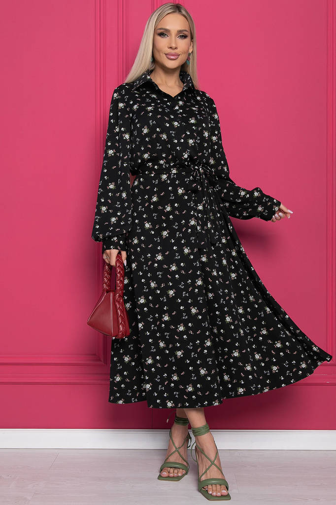 Артикул: П8356. Ткань: плательная "Ниагара". Состав: 95% п/э, 5% эластан. Цвет: черный. Принт: флористический. Вид застежки: на пуговицах . Силуэт: приталенное . Карманы:&nbs... Показать описаниеp;отсутствуют. Тип горловины: отложной. Длина изделия по спинке: 46/ 125 см, 48/ 125 см, 50/ 126 см, 52/ 127 см, 54/ 128 см. Рост модели: 168 см. Легкое и женственное платье с цветочным принтом на лето. В таком длинном платье Вы будете изящной и неповторимой. Расклешенный крой делает образ еще более романтическим. В верхней части пуговицы до талии. Рукав длинный, втачной, по низу манжет с пуговицей. Пояс из основной ткани входит в комплект. Уход за изделием: ручная стирка до 30 градусов; нельзя отбеливать; деликатный отжим; гладить при t не более 110 С; гладить с изнанки. *Допуск отклонения длины при массовом производстве 1-3 см является нормой.