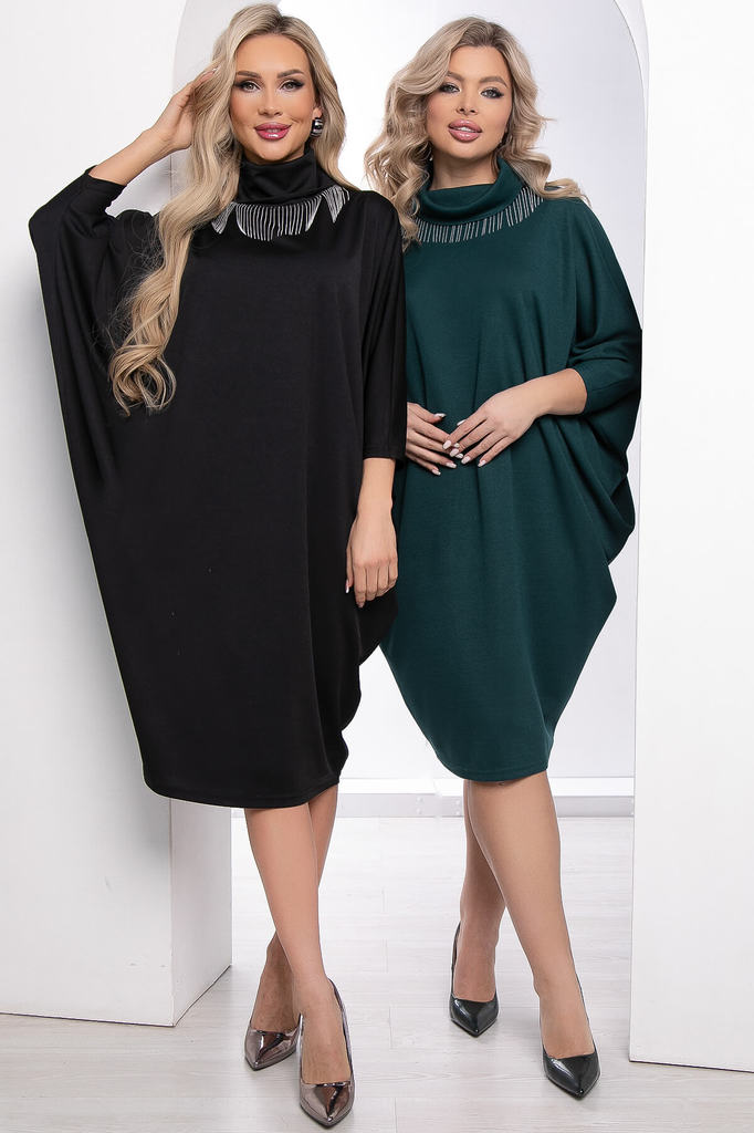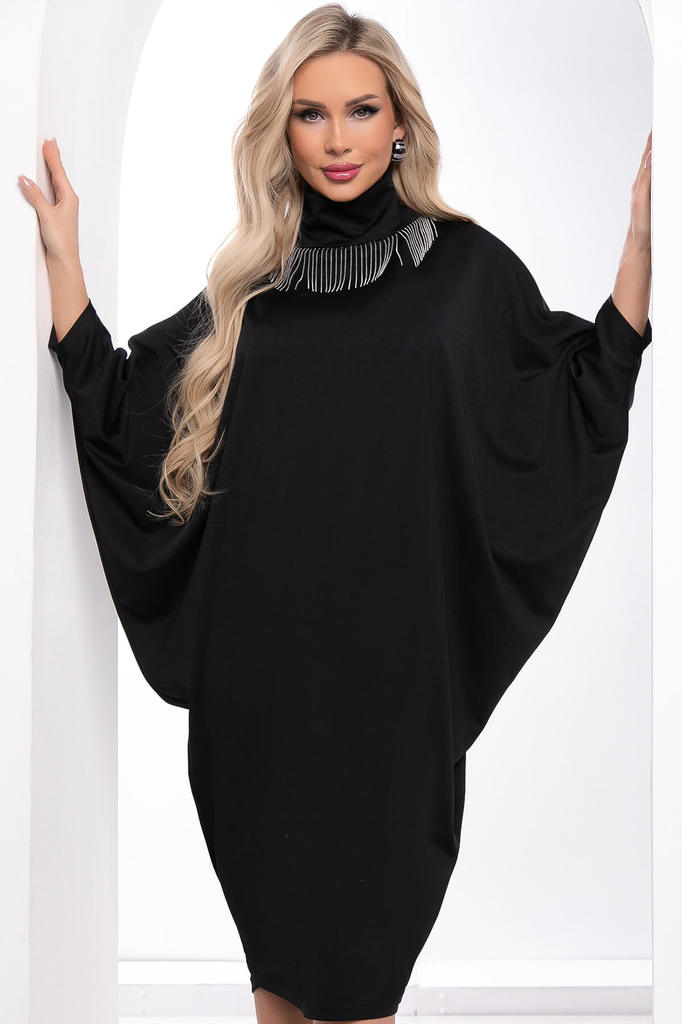 Артикул: П8387. Ткань: трикотаж Состав: 95% п/э, 5% эластан. Цвет: чёрный. Вид застежки: без застежки. Силуэт: свободный. Карманы: отсутствует. Тип горловины: хомут. Длина изделия по спинке:... Показать описание 46/ 106 см, 48-50/ 107 см, 52-54/ 108 см, 56/ 109 см. Рост модели: 168 см. Трикотажное платье свободного кроя . Модель подразумевает свободную посадку. Рукав длинный, скроенный по типу "летучая мышь". Воротник хомут с акцентной деталью. При выборе размера рекомендуем ориентироваться на размерную таблицу. Уход за изделием: ручная стирка до 30 градусов; нельзя отбеливать; деликатный отжим; гладить при t не более 110 С; гладить с изнанки. *Допуск отклонения длины при массовом производстве 1-3 см является нормой.