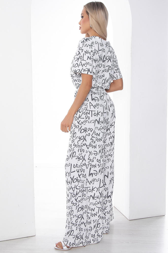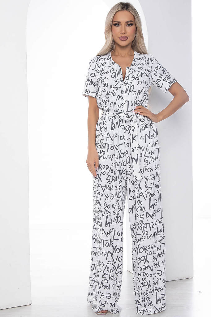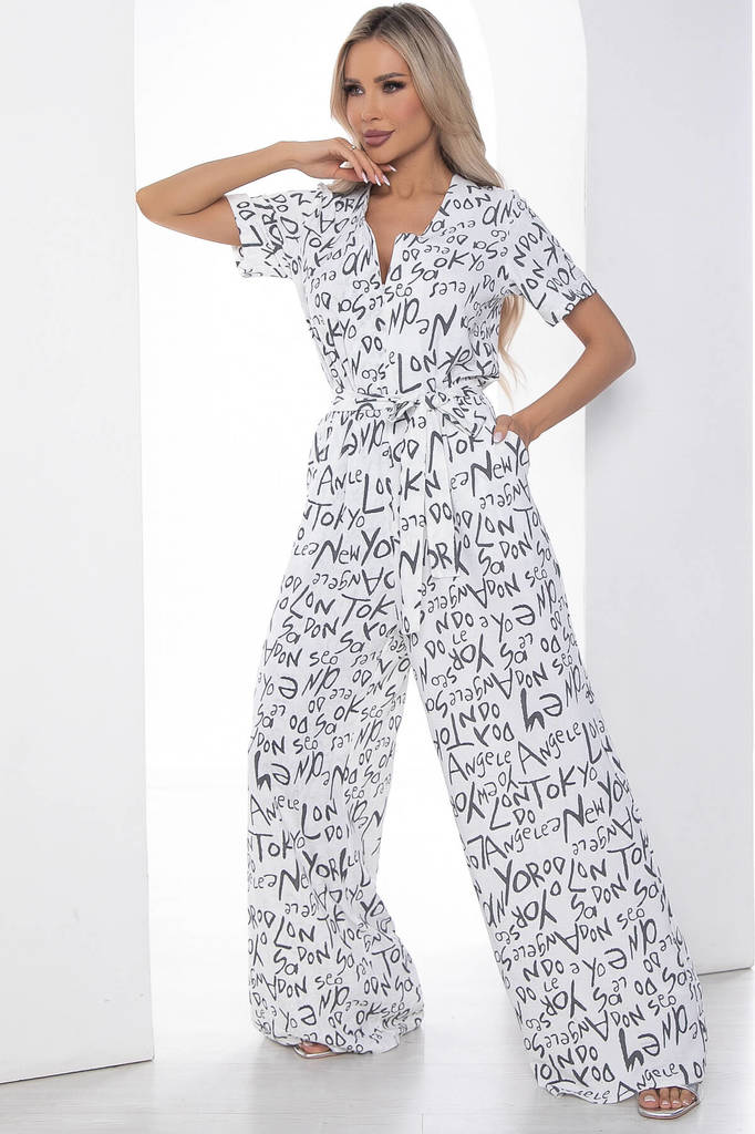 Артикул: К10074. Ткань: Сингапур. Состав: 83% п/э, 12% вискоза, 5% эластан. Цвет: белый. Принт: буквы. Вид застежки: потайная молния на груди. Силуэт: свободный. Карманы: есть. Длина ко... Показать описаниембинезона по спинке: 44-54/ 158 см. Рост модели: 168 см. Яркий комбинезон из лёгкой ткани идеально подойдёт для повседневного расслабленного образа. Свободный крой не сковывает движений и дарит комфорт. Рукав втачной, короткий. Акцент образу придает вырез, который идеально подчеркивает зону декольте. В таком комбинезоне вы точно не останетесь незамеченной! Уход за изделием: ручная стирка до 30 градусов; нельзя отбеливать; деликатный отжим; гладить при t не более 110 С; гладить с изнанки. *Допуск отклонения длины при массовом производстве 1-3 см является нормой.