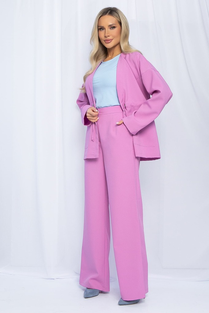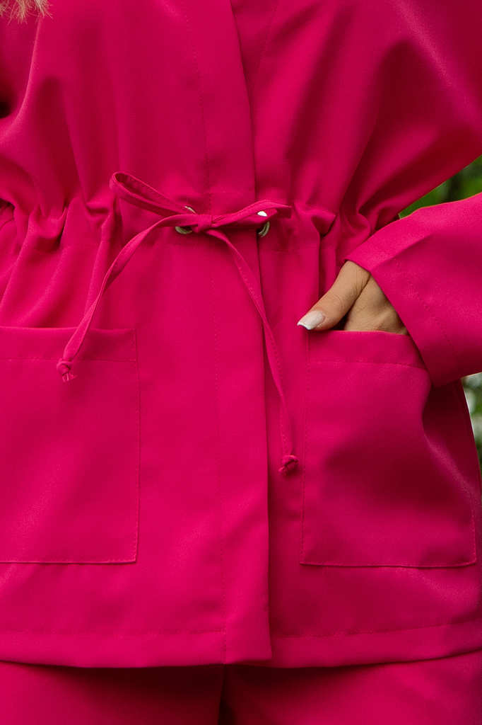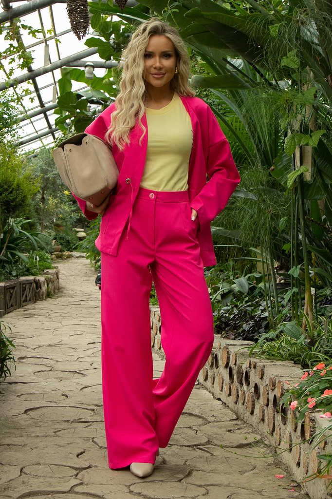 Состав: 100% полиэстер. Материал: габардин. Цвет: фуксия. Принт: отсутствует. Силуэт: полуприлегающий. Карманы: есть. Резинка в поясе: отсутствует. Вид застежки: на брюках молния и пуговица,... Показать описание на жакете люверсы и шнурки. Декоративные элементы: шнурки из костюмной ткани. Длина верха: 44/ 70 см, 46/ 70.5 см, 48/ 71 см, 50/ 71.5 см, 52/ 72 см, 54/ 72.5. Длина брюк: 44/ 110.5 см, 46/ 111 см, 48/ 111.5 см, 50/ 112 см, 52/ 112.5 см, 54/ 113 см. Костюм отснят с топом арт.Б13408-34М Костюм двойка, состоящий из элегантного жакета и брюк, станет идеальным выбором для деловых встреч и особых мероприятий. Жакет выполнен в современном дизайне: вы можете затянуть шнурки и подчеркнуть фигуру, а можете оставить жакет в свободном виде. Брюки оснащены удобной застежкой на пуговицу и молнию, что обеспечивает надежную посадку и комфорт в носке. Уход за изделием: ручная стирка до 30 градусов; нельзя отбеливать; отжим запрещён; гладить при t не более 110 С; гладить с изнанки. Внимание! Рекомендуем ориентироваться на размерную сетку и выбирать свой привычный размер, согласно размерной таблице. *Допуск отклонения длины при массовом производстве 1-3 см является нормой.