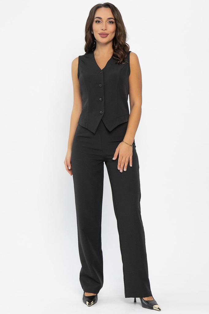 Состав : 65% полиэстер, 30% вискоза, 5% эластан Материал : костюмный Цвет : черный Принт : отсутствует Силуэт : полуприлегающий Карманы : отсутствуют Резинка в поясе : нет Вид застежки : брюки на молн... Показать описаниеии, жилет на пуговицах Декоративные элементы : отсутствуют Стильный костюм в черном цвете станет ярким акцентом в вашем гардеробе. Этот комплект включает в себя элегантные брюки на молнии и жилет, оформленный четырьмя пуговицами. Подходит и как повседневный вариант, и как вариант для мероприятий. Этот костюм станет отличным выбором для тех, кто ценит стиль и комфорт. Рекомендуем поиграть со стилизацией: сочетайте костюм с классической рубашкой или же с топом, а можно сразу надеть жилет без нижнего слоя! Внимание! Рекомендуем ориентироваться на размерную сетку и выбирать свой привычный размер, согласно размерной таблице. *Допуск отклонения длины при массовом производстве 1-3 см является нормой. Уход за изделием: Ручная стирка или стирка в машине при температуре до 30 °C, деликатный режим. Не использовать отбеливатели. Разрешена глажка при температуре до 110 °C. При глажке использовать специальную насадку на подошве утюга, гладить с паром. Не замачивать и не выжимать. Стирать изделие наизнанку, отдельно от других вещей.