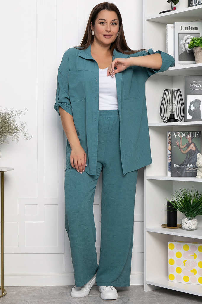 Артикул: К9078. Ткань: плательная "Прада". Состав: 95%п/э, 5% эластан. Цвет: бирюзовый. Вид застежки: пуговицы на рубашке. Силуэт: свободный. Карманы: есть. Длина верха по спинке: 44/ 5... Показать описание1 см, 46/ 52 см, 48/ 53 см, 50/ 54 см, 52/ 55 см, 54/ 56 см. Длина брюк с учетом резинки: 44/ 101 см, 46/ 106 см, 48/ 106 см, 50/ 107 см, 52/ 107 см, 54/ 107 см. Рост модели: 170см. Костюм из лёгкой ткани, состоящий из свободной рубашки и брюк, идеально подойдёт для летнего расслабленного образа. Свободный крой не сковывает движений и дарит комфорт. Карманы в боковых швах у брюк. Рубашка застёгивается на пуговицы. Уход за изделием: бережная стирка до 30 градусов; нельзя отбеливать; деликатный отжим; гладить при t не более 110 С; гладить с изнанки. *Допуск отклонения длины при массовом производстве 1-3 см является нормой.