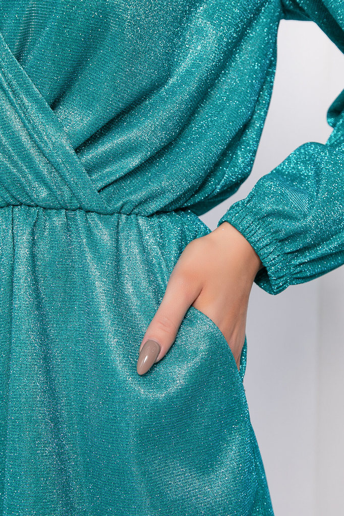 Артикул: К7911. Ткань: трикотаж с глиттером. Состав: 95% п/э, 5% эластан. Цвет: бирюзовый. Вид застежки: без застёжки. Силуэт: свободный. Карманы: есть. Тип горловины: V-образный с имитацией... Показать описание запаха. Длина изделия по спинке: 44-48/ 93 см, 50-52/ 94 см. Рост модели: 170 см. Шикарный комбинезон, в котором вы будете сиять! Невероятно красивый верх, скроенный с имитацией запаха, имеет втачной укороченный расклешённый рукав. Широкие шорты, безусловно, являются акцентной деталью образа и делают его неповторимым - они визуально удлиняют ножки. По талии на резинке. В комплект входит пояс из основной ткани, который позволяет дополнительно подчеркнуть талию. Блестки могут осыпаться! При изготовлении ткани глиттер наносится на неё в большем количестве, чем необходимо. Осыпаются излишки, которые недостаточно хорошо были закреплены на трикотажном полотне при производстве. Рекомендуем только ручную стирку при температуре 30 С, без отжима. Уход за изделием: ручная стирка до 30 градусов; нельзя отбеливать; деликатный отжим; гладить при t не более 110 С; гладить с изнанки. *Допуск отклонения длины при массовом производстве 1-3 см является нормой.