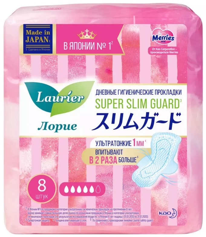 KAO Гигиенические прокладки Laurier Super Slim Guard ПЯТЬ КАПЕЛЬ для обильных выделений с крылышками ультратонкие, 25 см 8 штВопросы по товару