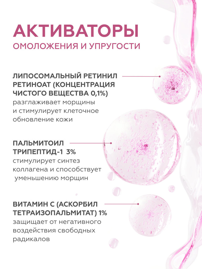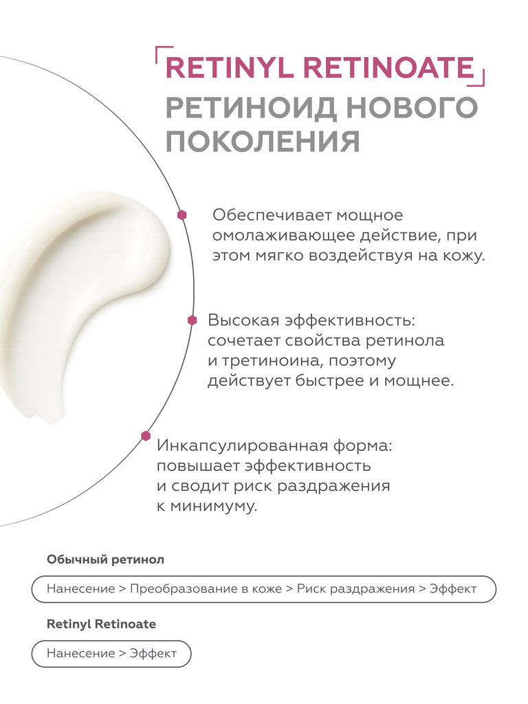 Гель предназначен для всех типов кожи с возрастными изменениями: морщинами, потерей эластичности, пигментацией, тусклым цветом лица. Также показан для кожи со склонностью к воспалениям и чёрным точкам... Показать описание, с жирным блеском и расширенными порами, рубцами и застойными пятнами постакне. Эффективен для кожи со склонностью к гиперкератозу, образованию пигментации, с неровным тоном. Хэдлайнерами состава выступают липосомальный ретинол 1% и пальмитоил трипептид-1, последний из которых является сигнальным пептидом с ретинолоподобным действием. Он стимулирует синтез коллагена и гликозаминогликана, способствует укреплению эпидермиса и уменьшению морщин. Кроме того, при совместном применении с ретинолом, данный компонент усиливает его действие, придавая коже молодой и здоровый вид. Сквалан и биоцерамидный комплекс в составе поддерживают необходимый уровень увлажнённости кожи и улучшают её барьерную функцию. Масло сладкого миндаля и витамин Е защищают кожу от негативного внешнего воздействия, смягчая её и делая более упругой. Бисаболол успокаивает раздражённую кожу, ускоряет заживление, помогает уменьшить воспаления и покраснения. Такой состав сводит к минимуму побочные эффекты от ретинола, такие как раздражения, сухость и шелушение. Благодаря этому сочетанию компонентов при регулярном применении кожа становится более гладкой, подтянутой, ровной по тону и текстуре. Гель является следующим этапом после применения крем-сыворотки Retiderm 0.5. С осторожностью применять при чувствительной коже. Особые меры предосторожности: не рекомендуется использовать гель при текущей или планируемой беременности, грудном вскармливании, совмещать с другими топическими и системными ретиноидами. Не применять при нарушении целостности кожных покровов.