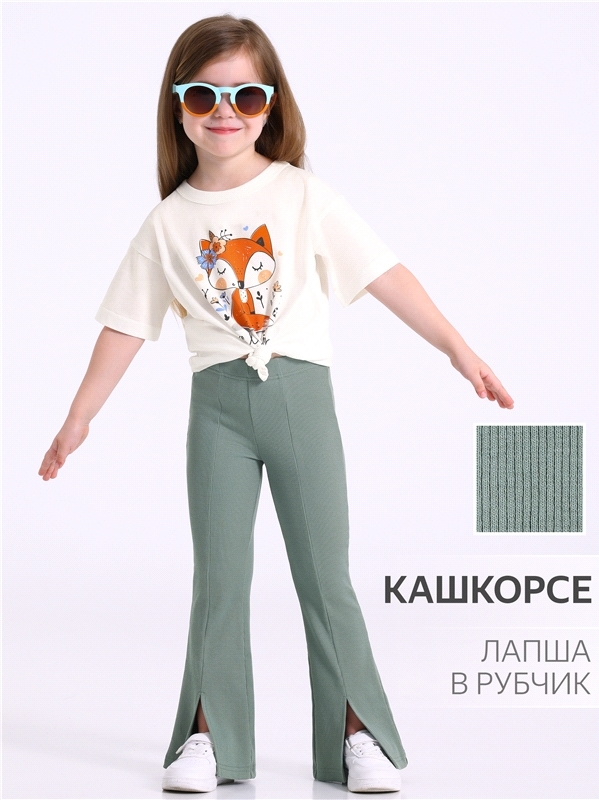 Брюки-клеш для девочки выполнены из ластика - эластичного хлопкового полотна в рубчик. Изделие со средней высотой посадки, на эластичном поясе, декорировано острочками-стрелкам и разрезами. Уход: толь... Показать описаниеко машинная стирка (руками не стирать!) при температуре 40 градусов, без предварительного замачивания. Состав: ластик / хлопок 95% + лайкра 5%.