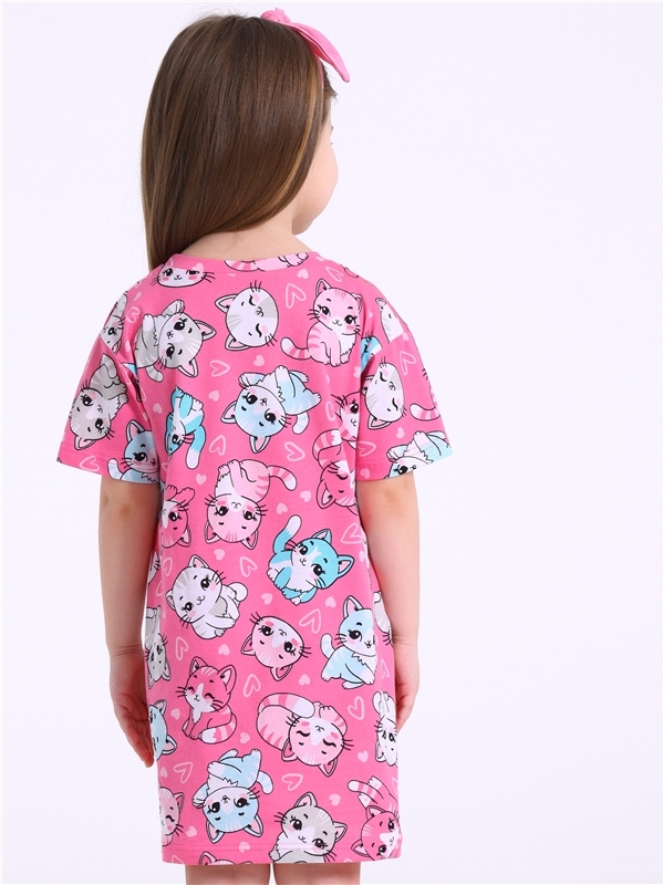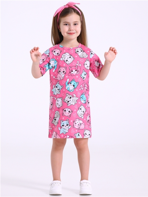 Платье для девочки выполнено из кулира - тонкого хлопкового полотна с лайкрой. Изделие с короткими рукавами, на кокетке. Веселый принт и нашивные элементы имитируют мордочку зверушки. Уход: только маш... Показать описаниеинная стирка (руками не стирать!) при температуре 40 градусов, без предварительного замачивания. Изделия с печатью и декором перед стиркой необходимо вывернуть на изнаночную сторону. Состав: кулир с лайкрой / хлопок 92% + лайкра 8%.