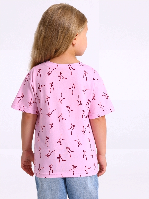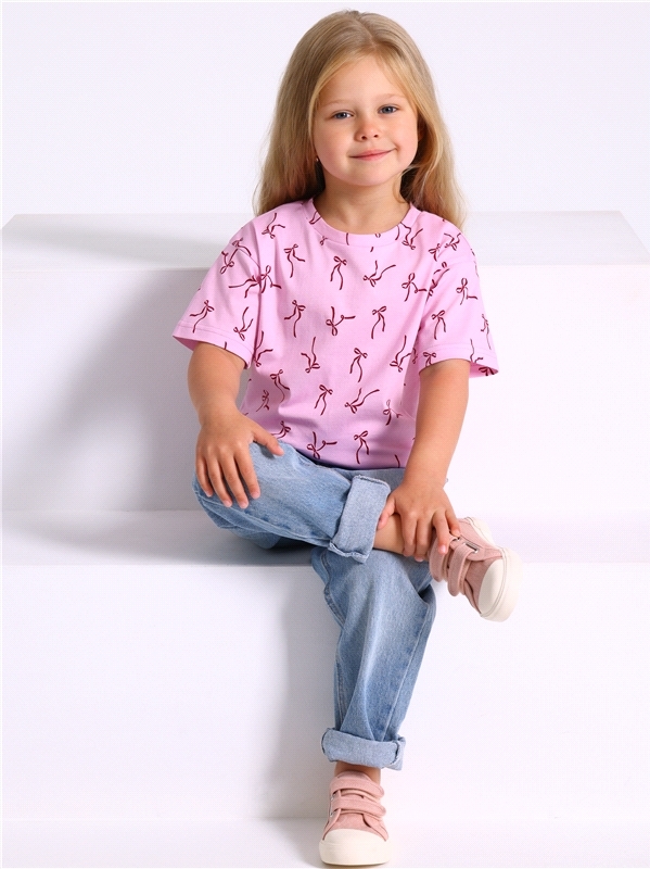 Футболка для девочки из кулира - легкого хлопкового полотна. Изделие с короткими рукавами со спущенным плечом, украшено набивным принтом. Уход: только машинная стирка (руками не стирать!) при температ... Показать описаниеуре 40 градусов, без предварительного замачивания. Состав: кулир / хлопок 100%.