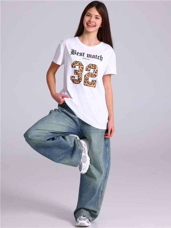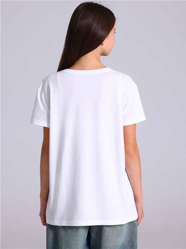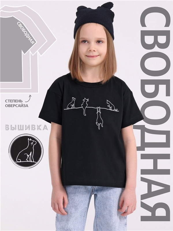 Футболка для девочки из кулира - легкого хлопкового полотна. Изделие с короткими рукавами со спущенным плечом:украшено дизайнерской вышивкой. Отличный выбор для юной модницы! Уход: только машинная сти... Показать описаниерка (руками не стирать!) при температуре 40 градусов:без предварительного замачивания. Изделия с печатью и декором перед стиркой необходимо вывернуть на изнаночную сторону. Состав: кулир / хлопок 100%.