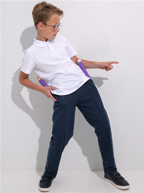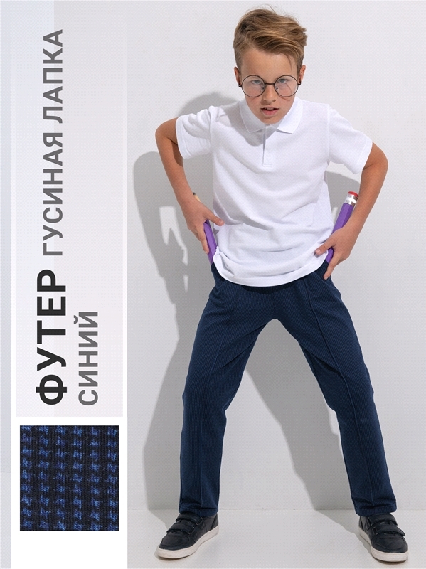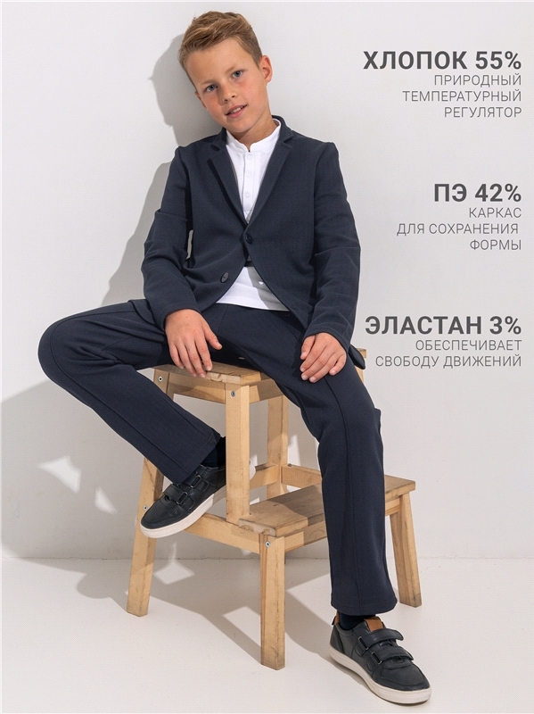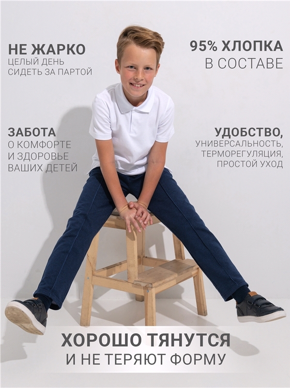 Брюки для мальчика выполнены из плотного полотна с рельефным рисунком:выполненным с применением жаккардового плетения. Изделие на эластичном поясе:имеет удобные карманы и декоративные отстрочки-стрелк... Показать описаниеи. Отличный вариант для школы! Уход: только машинная стирка (руками не стирать!) при температуре 40 градусов:без предварительного замачивания. Ассортимент осенне-зимнего периода. Состав: жаккард / хлопок 55% + ПЭ 42% + лайкра 3%.