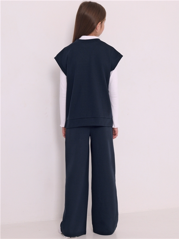 Комплект для девочки из жилета и брюк выполнен из плотного полотна с рельефным рисунком:выполненным с применением жаккардового плетения. Жилет прямого кроя с v-образным вырезом горловины:без карманов ... Показать описаниеи со спущенной линией плеча. Брюки-палаццо без карманов на удобном эластичном поясе. Отличный вариант для школы и не только!Уход: только машинная стирка(руками не стирать!) при температуре 40 градусов:без предварительного замачивания. Ассортимент осенне-зимнего периода. Состав: жаккард / хлопок 55% + ПЭ 42% + лайкра 3%.