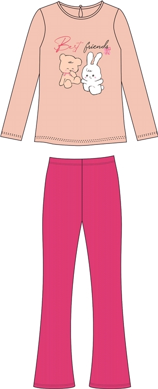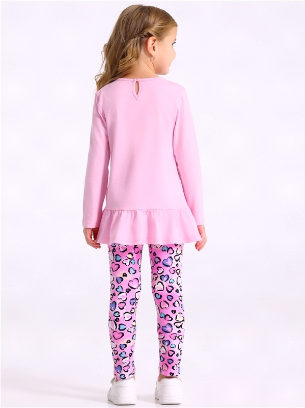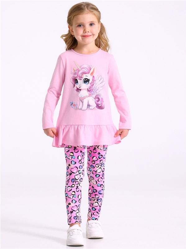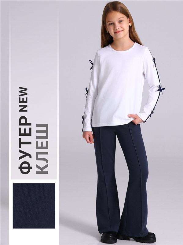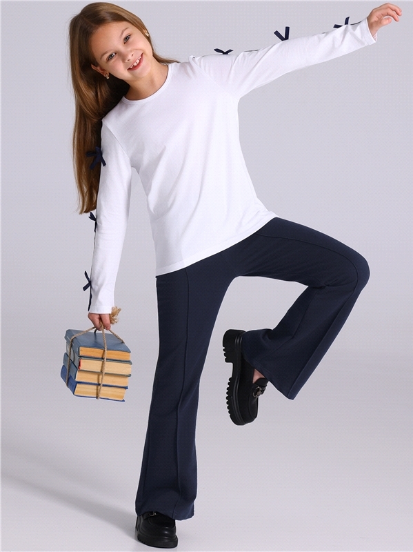 Костюм для девочки состоит из лонгслива и брюк. Лонгслив для девочки выполнен из кулира - легкого хлопкового плотна. Изделие прямого силуэта и свободного кроя:с длинными рукавами со спущенной линией п... Показать описаниелеча:вырез горловины обработан эластичной бейкой из полотна компаньона. Брюки-клеш выполнены из ластика - эластичного хлопкового полотна в рубчик с добавлением лайкры. Изделие на комфортном эластичном поясе:клеш от колена. Уход: только машинная стирка (руками не стирать!) при температуре 40 градусов:без предварительного замачивания. Изделия с печатью и декором перед стиркой необходимо вывернуть на изнаночную сторону. Состав: / хлопок 100%:хлопок 92% + лайкра 8%.