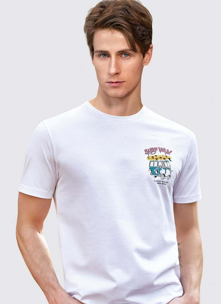 Футболка Berrak классического фасона белого цвета прямого кроя, с коротким рукавом и округлым вырезом. Свободная посадка. С принтом. Рукав втачной с манжетом. Футболка сшита из 100 % хлопка pamuk.