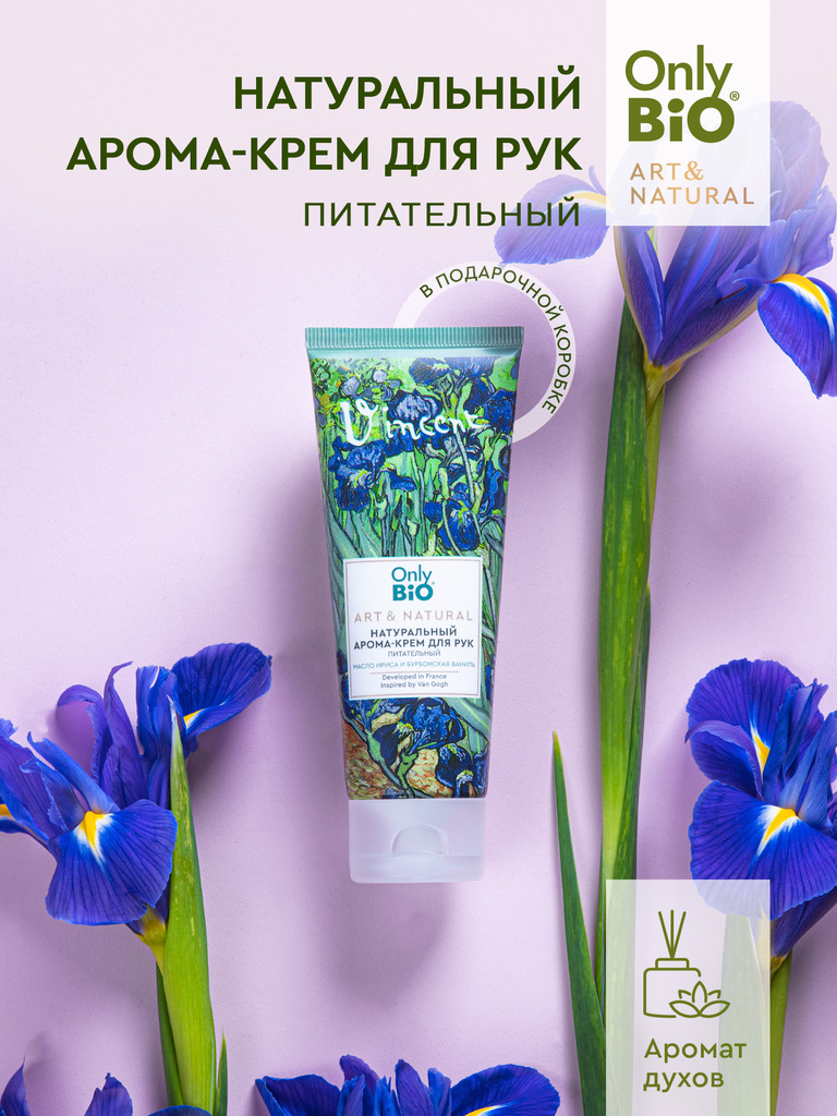 Бренд ONLY BIO ART&NATURAL - это больше, чем просто кремы для рук и тела. Это аромаколлекция, воспевающая красоту природы и вдохновленная работами гениальных художников. В формулах Only Bio заключена ... Показать описаниечистота природы Прованса, не тронутая урбанизацией: экстракты, натуральные масла и ароматы, уносящие Вас в счастливые моменты и мир пейзажей импрессионистов. ONLY BIO ART&NATURAL АРОМА-КРЕМ ДЛЯ РУК НАТУРАЛЬНЫЙ ПИТАТЕЛЬНЫЙ МАСЛО ИРИСА И БУРБОНСКАЯ ВАНИЛЬ - мягкая кожа, дарит коже изысканный аромат, восстанавливает и питает Арома-крем для рук с драгоценным маслом ириса и бурбонской ванилью деликатно ухаживает за кожей рук. Питательная и насыщенная формула крема дарит коже гладкость, упругость и терпкий изысканный аромат, погружая в глубину красочной живописи Ван Гога. Крем для рук ONLY BIO пахнет как духи ПИРАМИДА АРОМАТА Начальные ноты - белый мускус, ирис, нероли Ноты сердца - бурбонская ваниль, флёрдоранж, фиалка Шлейф - амбра, ваниль, ветивер Специальные особенности: без SLS, без SLES, без парабенов, гипоаллергенно Результат: Кожа рук нежная, мягкая и упругая, манящий аромат