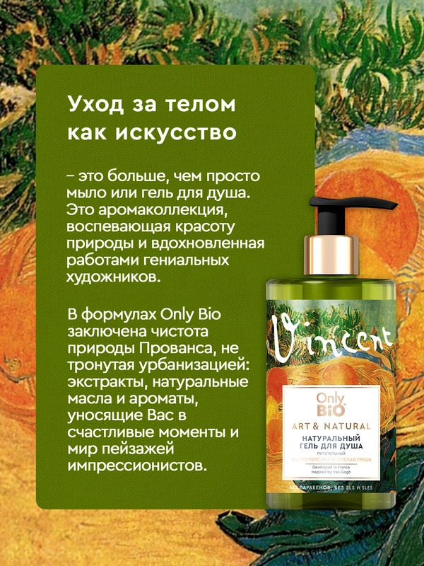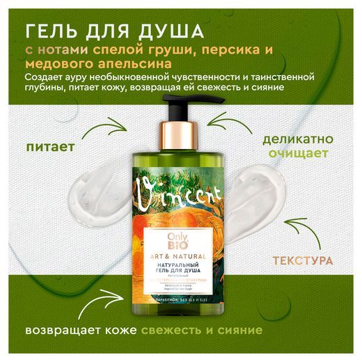 Бренд ONLY BIO ART&NATURAL - это больше, чем просто средства по уходу за телом, это аромаколлекция, воспевающая красоту природы и вдохновленная работами гениальных художников. В формулах Only Bio закл... Показать описаниеючена чистота природы Прованса, не тронутая урбанизацией: экстракты, натуральные масла и ароматы, уносящие Вас в счастливые моменты и мир пейзажей импрессионистов. ONLY BIO ART&NATURAL ГЕЛЬ ДЛЯ ДУША НАТУРАЛЬНЫЙ ПИТАТЕЛЬНЫЙ МАСЛО ПЕРСИКА И СПЕЛАЯ ГРУША - для всех типов кожи Тёплый фактурный аромат геля для душа раскрывается нотами спелой груши, персика и медового апельсина. Гель деликатно очищает и питает кожу, возвращая ей свежесть и сияние. 98% натуральных компонентов Гель создаёт ауру необыкновенной чувственности и таинственной глубины. Гель для душа ONLY BIO пахнет как духи ПИРАМИДА АРОМАТА Начальные ноты - пудровый ирис, мускус, медовый апельсин Ноты сердца - персик, груша, ваниль Шлейф - пачули, иланг-иланг, сливочное пралине Специальные особенности: без SLS, без SLES, без парабенов, гипоаллергенно Результат: Кожа очищена и напитана, манящий аромат