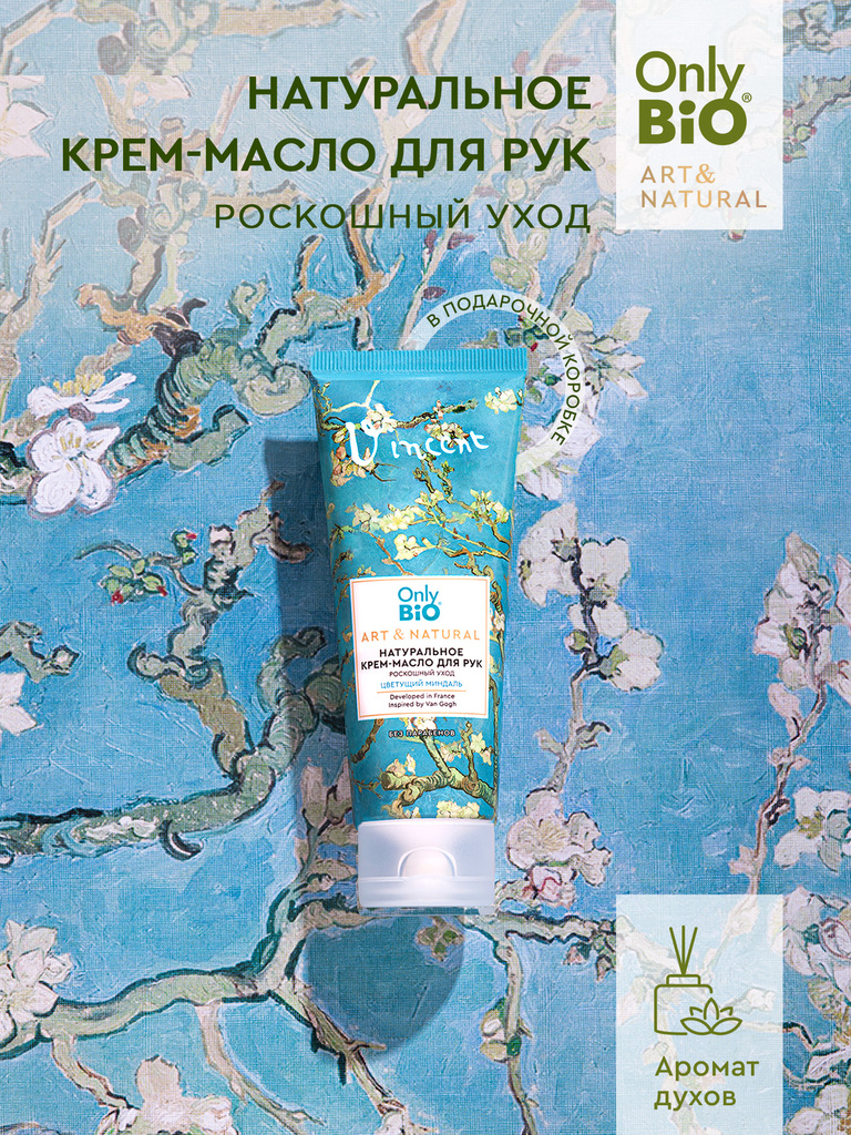 Бренд ONLY BIO ART&NATURAL - это больше, чем просто кремы для рук и тела. Это аромаколлекция, воспевающая красоту природы и вдохновленная работами гениальных художников. В формулах Only Bio заключена ... Показать описаниечистота природы Прованса, не тронутая урбанизацией: экстракты, натуральные масла и ароматы, уносящие Вас в счастливые моменты и мир пейзажей импрессионистов. ONLY BIO ART&NATURAL КРЕМ-МАСЛО ДЛЯ РУК НАТУРАЛЬНОЕ РОСКОШНЫЙ УХОД ЦВЕТУЩИЙ МИНДАЛЬ - питает и увлажняет, бережно ухаживает, дарит коже потрясающую мягкость Крем- масло с роскошной текстурой и тонким окутывающим ароматом цветков миндаля бережно ухаживает за кожей рук, питая и восстанавливая ее. Нежно раскрываясь сливочными нотами, крем наполняет гармонией и дарит коже потрясающую мягкость. Прикоснись к шедевру Ван Гог Крем для рук ONLY BIO пахнет как духи ПИРАМИДА АРОМАТА Начальные ноты - белоснежная гардения, цветок миндаля, пудровый ирис Ноты сердца - французский миндаль, цветок тиаре, франжипани Шлейф - амбра, ваниль, белый мускус Специальные особенности: без SLS, без SLES, без парабенов, без минеральных масел, гипоаллергенно Результат: Кожа рук нежная, мягкая и увлажненная, манящий аромат