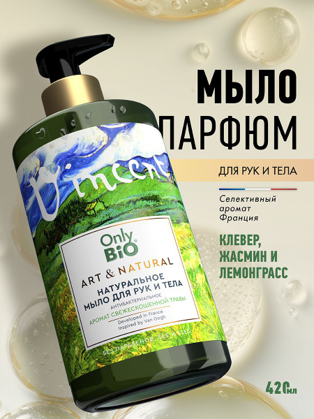 Бренд ONLY BIO ART&NATURAL - это больше, чем просто средства по уходу за телом, это аромаколлекция, воспевающая красоту природы и вдохновленная работами гениальных художников. В формулах Only Bio закл... Показать описаниеючена чистота природы Прованса, не тронутая урбанизацией: экстракты, натуральные масла и ароматы, уносящие Вас в счастливые моменты и мир пейзажей импрессионистов. ONLY BIO ART&NATURAL МЫЛО ДЛЯ РУК НАТУРАЛЬНОЕ АНТИБАКТЕРИАЛЬНОЕ АРОМАТ СВЕЖЕСКОШЕННОЙ ТРАВЫ - для всех типов кожи Мыло с потрясающим и таким милым сердцу ароматом: бархатистая свежескошенная трава, раскрывающаяся нотами клевера, лемонграсса и французского базилика. Мыло идеально очищает кожу и наполняет ароматом жизненной энергии, вдохновения и счастья. 98% натуральных компонентов Мыло для рук ONLY BIO пахнет как духи ПИРАМИДА АРОМАТА Начальные ноты - клевер, французский базилик, зелёный инжир Ноты сердца - лепестки жасмина, мускатный шалфей, лемонграсс Шлейф - мох, сочный ревень, фиалка Специальные особенности: без SLS, без SLES, без парабенов, гипоаллергенно Результат: Кожа рук очищена и увлажнена, манящий аромат