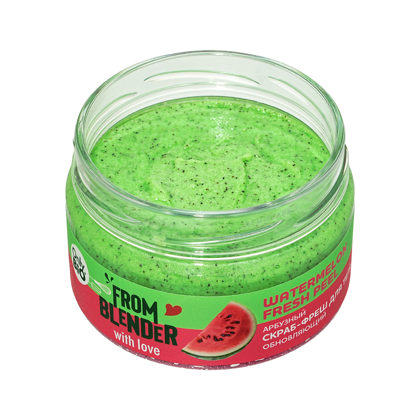 Watermelon Fresh Peel Арбузный Скраб-фреш для тела Обновляющий FROM BLENDER WITH LOVE. Внешний вид: Кремовая текстура с скрабирующими частичками светло-зеленого цвета с арбузным запахом. From blender ... Показать описаниеwith love- натуральный гурманский уход для лица, тела и волос, вобравший в себя всю пользу свежевыжатых фруктовых соков, ягод и перемолотых орехов - словно они попали в баночку прямо из блендера. Скраб-фреш с гималайской солью отлично отшелушивает ороговевшие клетки кожи, возвращая ей мягкость и бархатистость. Фруктовые кислоты абрикоса и папаин усиливают эффект очищения, выравнивая тон кожи, придавая ей гладкость и сияние. А аромат сочного арбуза освежает и дарит заряд бодрости на весь день! Результат: Кожа гладкая, сияющая.