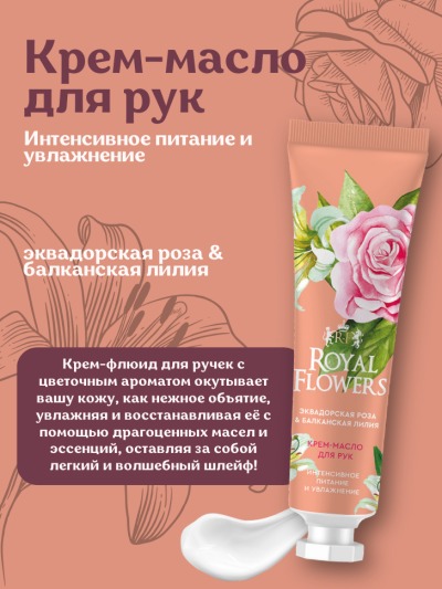 ROYAL FLOWERS КРЕМ-МАСЛО ДЛЯ РУК ИНТЕНСИВНОЕ ПИТАНИЕ И УВЛАЖНЕНИЕ Кремы для рук с роскошными ароматами окутывают легким шлейфом цветочных аккордов, перемещая вас в самые знаменитые цветочные оранжереи... Показать описание. Цветы из королевских садов со всего мира для красоты и ухода за кожей рук. Драгоценные цветочные масла и эссенции увлажняют, питают и восстанавливают кожу. Рекомендовано: для любого типа кожи Эффект: Питание, увлажнение, мягкость кожи, восстановление, арома-эффект.