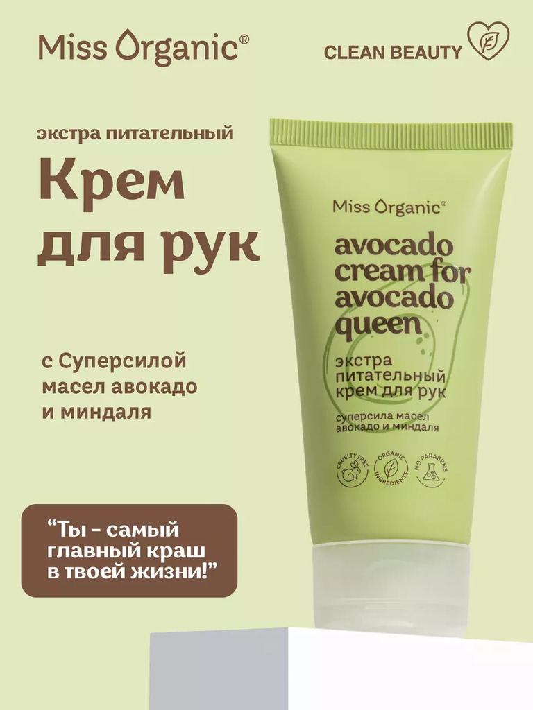 MISS ORGANIC КРЕМ ДЛЯ РУК ЭКСТРА ПИТАТЕЛЬНЫЙ - кожа рук нежнее, чем шелк? Легко! Ведь за дело берутся два героя с суперсилой: масла авокадо и миндаля. Они мгновенно насыщают кожу полезными веществами,... Показать описание избавляя ее от сухости и шелушения. Ммм... теперь к твоим ручкам так хочется прикоснуться. Это идеальное уходовое средство для женщин, девушек и девочек-подростков, которые заботятся о своей коже. Этот крем разработан специально для борьбы с сухостью и шелушениями, обеспечивая глубокое увлажнение и питание для кожи рук всех типов, включая чувствительную и нормальную. АКТИВНЫЕ ИНГРЕДИЕНТЫ: Масло авокадо - насыщает кожу полезными веществами, избавляет от сухости и шелушения Масло миндаля - питает, увлажняет, успокаивает кожу, придает мягкость Состав крема Miss Organic включает в себя натуральные экстракты, которые не только смягчают, но и восстанавливают поврежденную кожу. Он эффективно борется с мелкими трещинками и ранками, возникающими из-за сухости и обветривания. Масло авокадо активно увлажняет и питает, улучшая текстуру кожи, а масло миндаля обладает успокаивающими свойствами, что делает его идеальным для тех, кто страдает от раздражений. Оливковое масло усиливает защитные функции кожи, обеспечивая защиту от ветра, мороза и УФ-излучения, что особенно актуально в холодное время года. Этот увлажняющий крем не только заботится о состоянии ваших рук, но и помогает в регенерации кожи, осветляя пигментные пятна и предотвращая проявление пигментации. Его легкая текстура и ароматизированный состав делают использование крема приятным и комфортным. Питательный крем для рук станет отличным помощником в вашей уходовой косметике и неотъемлемой частью рутинного ухода за собой. Подходит для молодой и зрелой кожи, он обеспечит защиту и восстановление в любое время года. Не упустите возможность подарить своим рукам полноценный уход, который сделает их мягкими, ухоженными и красивыми!