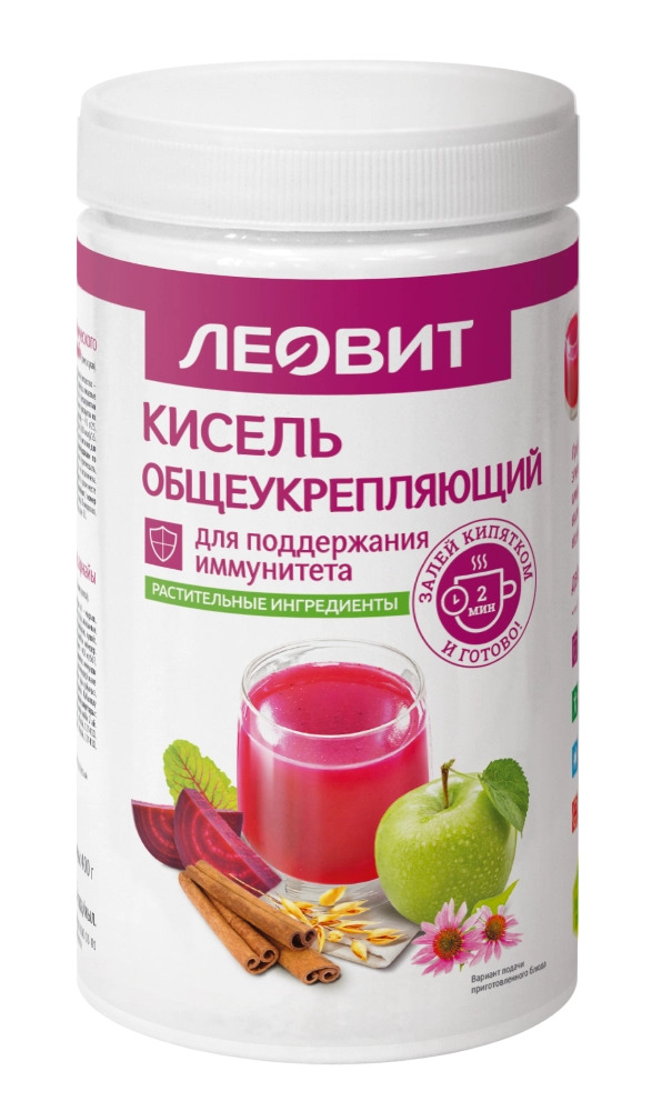 ЛЕОВИТ КИСЕЛЬ ОБЩЕУКРЕПЛЯЮЩИЙ - это специализированный пищевой продукт диетического профилактического питания для поддержания иммунной системы, с высоким содержанием витаминов С, Е и цинка. Напиток по... Показать описаниеможет повысить сопротивляемость организма к инфекциям и неблагоприятным факторам окружающей среды. Кисель эффективен в профилактике сезонных респираторных заболеваний, при различных воспалительных заболеваниях, при слабости, после переутомления, а также после болезни и в послеоперационный период. КОМПОНЕНТЫ, ВХОДЯЩИЕ В СОСТАВ КИСЕЛЯ: • Родиола розовая - обладает тонизирующим, стимулирующим, адаптогенным, ноотропным действием • Солодка - оказывает иммунотропное, антимикробное, противолихорадочное, обволакивающее, болеутоляющее действие • Эхинация - повышает иммунологическую активность организма • Корица - оказывает тонизирующее, обезболивающее, антисептическое действие ДЕЙСТВИЕ • Способствует укреплению иммунитета и защите от вирусов, бактерий, грибков • Повышает жизненные силы организма в период профилактики, лечения и реабилитации • Обеспечивает противовоспалительное действие • Оказывает стимулирующее действие на физическую и интеллектуальную работоспособность