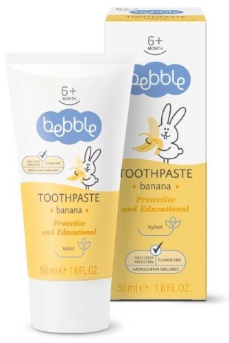 Бренд BEBBLE - натуральная гипоаллергенная косметика для детей BEBBLE ЗУБНАЯ ПАСТА ДЕТСКАЯ С АРОМАТОМ БАНАНА - деликатно очищает и защищает от кариеса первые зубки вашего ребенка. Возраст: с 6+ месяце... Показать описаниев Природный ксилит предотвращает рост микроорганизмов и способствует укреплению зубной эмали. Не содержит фтора и консервантов, что делает ее безвредной при проглатывании и подходит для использования с самого раннего возраста. Приятный банановый вкус и аромат помогает приучению ребенка к ежедневной гигиене полости рта Не содержит ментол. Рекомендовано использовать с первого зуба до 3 лет Специальные особенности: без консервантов u красителей, с тщательно подобранными ингредиентами.