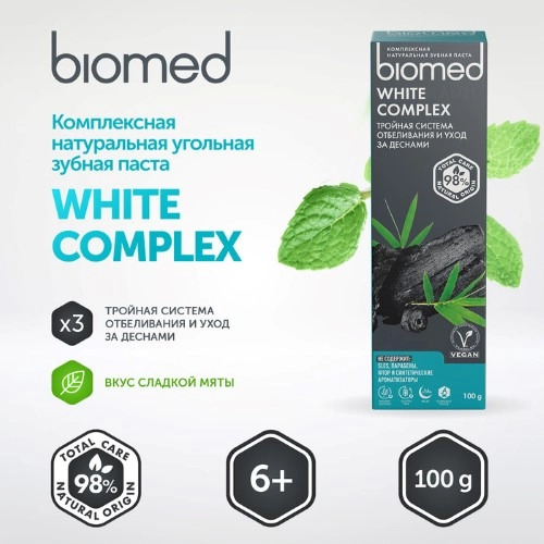 Biomed white complex зубная паста - тройная система отбеливания и уход за дёснами. BIOMED WHITE COMPLEX с бамбуковым, активированным и древесным углем эффективно отбеливает ваши зубы, осветляя до 1 то... Показать описаниена за 4 недели применения. Тройная система отбеливания эмали обусловлена содержанием трех видов угля для интенсивного отбеливания. Цитрат цинка обеспечивает свежесть дыхания, а экстракты подорожника и листьев березы обладают мощным противовоспалительным эффектом. Зубная паста рекомендована для всей семьи: детям от 6 лет и взрослым. Рекомендуется чистить зубы 2 раза в день после приема пищи.