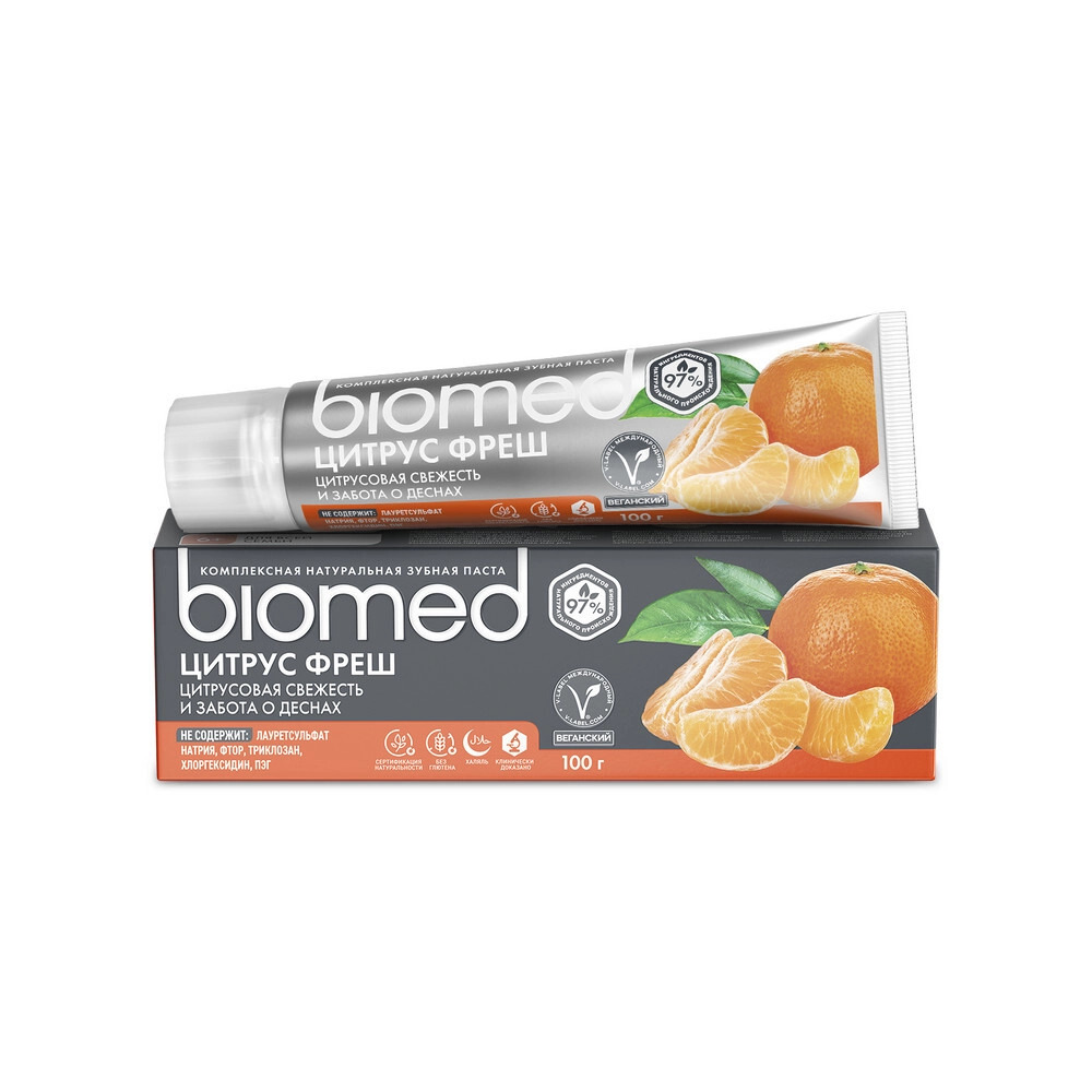 Biomed vitafresh зубная паста 100 гр - антибактериальная зубная паста для свежести дыхания и укрепления эмали. Натуральные эфирные масла грейпфрута, мандарина, лимона и мяты обеспечивают СВЕЖЕСТЬ дыха... Показать описаниения, обладают УСПОКАИВАЮЩИМ и ТОНИЗИРУЮЩИМ эффектом. Глюконат цинка препятствует размножению бактерий, вызывающих неприятный запах изо рта. Фермент бромелаин из экстракта ананаса обеспечивает расщепление белкового налета. Глицерофосфат кальция и L-Arginine укрепляют и восстанавливают зубную эмаль. Входящие в состав экстракты подорожника, листьев березы и можжевельника обладают противовоспалительным эффектом. Предназначена для ежедневного ухода за полостью рта детей от 6 лет и взрослых. Для оптимального результата рекомендуется чистить зубы в течение 2 минут.