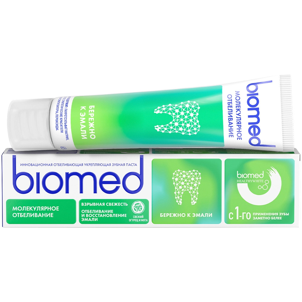 Инновационная отбеливающая укрепляющая зубная паста BIOMED ® молекулярное отбеливание «Активное отбеливание и восстановление эмали» со вкусом клубники. Эффект от использования продукта по результатам ... Показать описаниелабораторных и клинических исследований: • Активное отбеливание до 4 оттенков за 4 недели; • С 1-го курса применения зубы заметно белее; • Восстановление и укрепление эмали. Система отбеливания HEALTHYWHITE обеспечивает бережное осветление эмали c 1-го курса применения. Уникальный подход к отбеливанию основан на использовании запатентованного соединения, которое генерирует синглетный кислород — самую активную и бережную форму кислорода. Инновационное соединение избирательно воздействует только на пигменты, вызывающие потемнение, при этом полностью сохраняя структуру эмали. HEALTHYWHITE — это тщательный контроль над безопасностью и эффективностью отбеливания, что делает продукт идеальным даже для чувствительных зубов. Эффективность доказана лабораторными исследованиями в Великобритании. Продлевает эффект белизны эмали после профессионального отбеливания и гигиены полости рта.