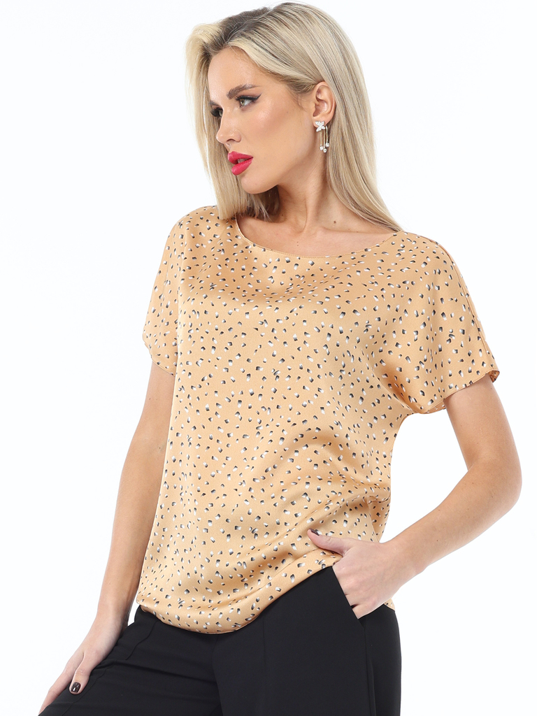 Эта блузка с принтом выполнена из легкой ткани, что делает её идеальной для повседневного ношения в теплое время года. Легкость ткани обеспечивает комфорт и воздухопроницаемость, что особенно важно в ... Показать описаниежаркие дни. Блузка имеет округлый вырез горловины, который аккуратно обрамляет шею и придает образу элегантность и женственность. Короткие рукава добавляют блузке легкости и непринужденности. Они не сковывают движения и обеспечивают дополнительный комфорт в жаркую погоду. Принт добавляет блузке яркость и индивидуальность, делая её акцентным элементом вашего гардероба. Эта блузка с принтом отлично сочетается с различными элементами гардероба. Вы можете носить её с джинсами, юбками или брюками, создавая разнообразные образы для работы, прогулок или встреч с друзьями. Универсальный крой и стиль делают её подходящей для самых разных ситуаций. Длина: 44 размер - 69 см 46 размер - 69 см 48 размер - 70 см 50 размер - 70 см 52 размер - 71 см 54 размер - 71 см 56 размер - 72 см Бережная стирка при 30 градусах Цвет изделия на фотографии может отличаться от фактического товара, что связано с искажением цветопередачи монитором, настройками фотоаппаратуры и прочими факторами Пропорции 88 - 64 - 94 см Рост 172 см Размер 44