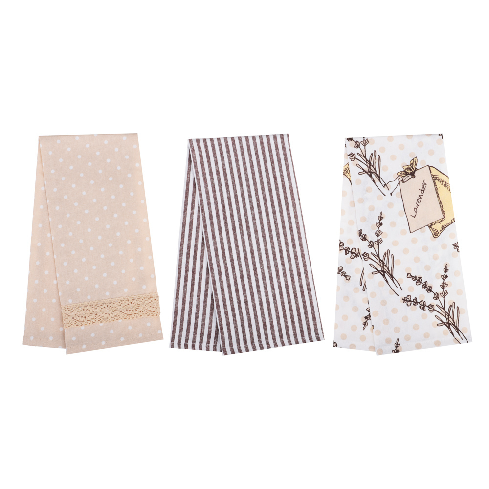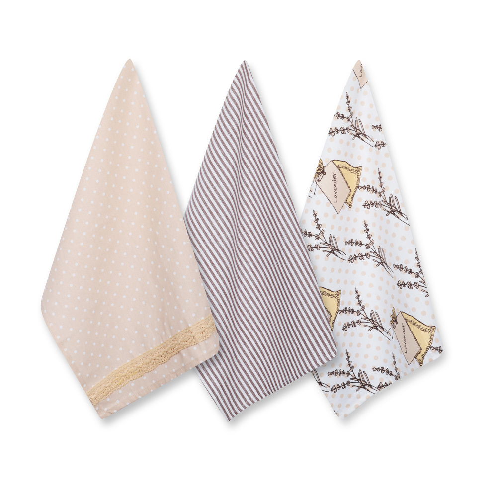 Комплект кухонных полотенец PROVANCE включает 3 полотенца с разными дизайнами размером 40х60 см. Практичный и эстетичный текстиль из 100% хлопка прекрасно впитывает влагу, не оставляет ворсинок на кож... Показать описаниее или поверхностях, поэтому полотенца можно использовать для удаления капель воды и разводов с посуды. Полотенца в сдержанных оттенках образуют единую стилевую композицию, гармонично дополняя интерьер кухни. Выдерживают многократные стирки с сохранением формы и цвета.
