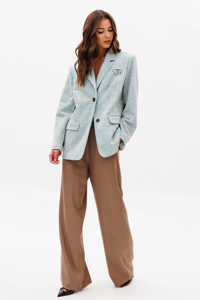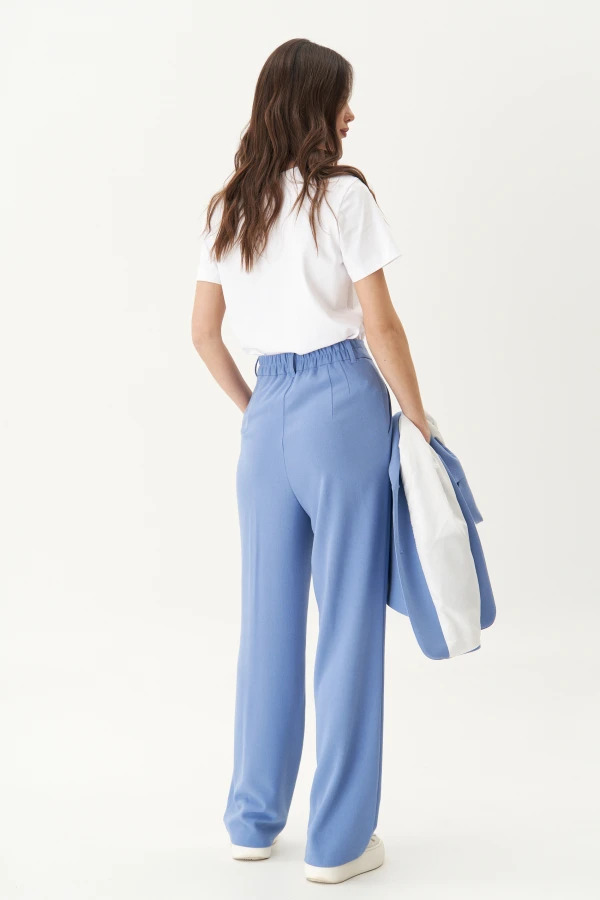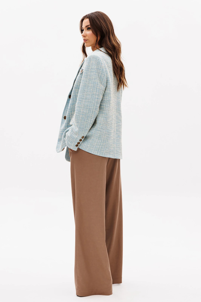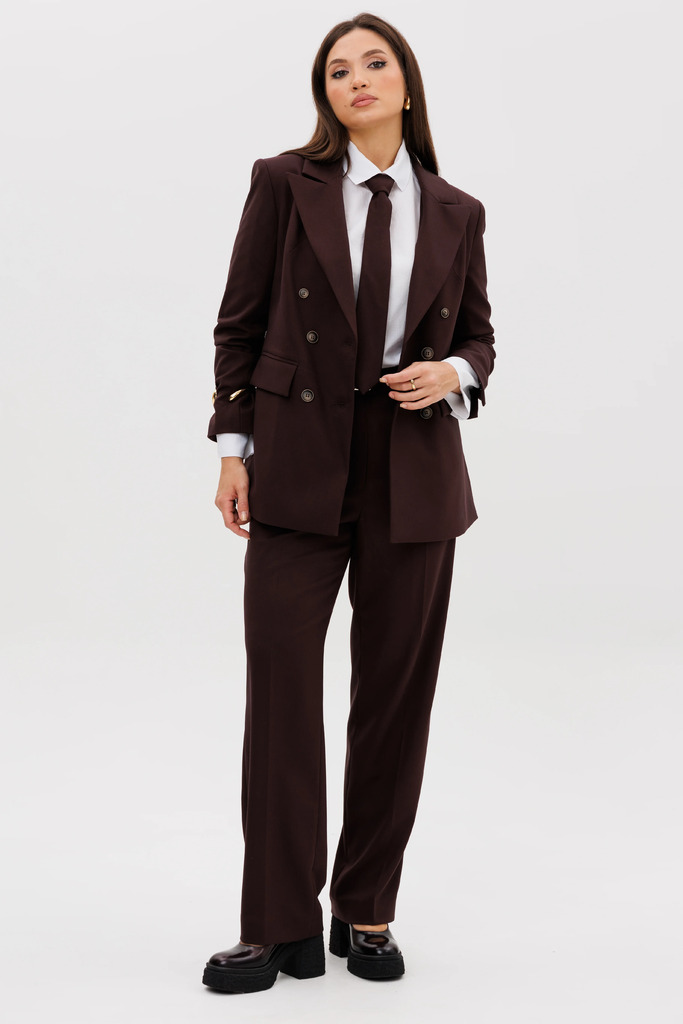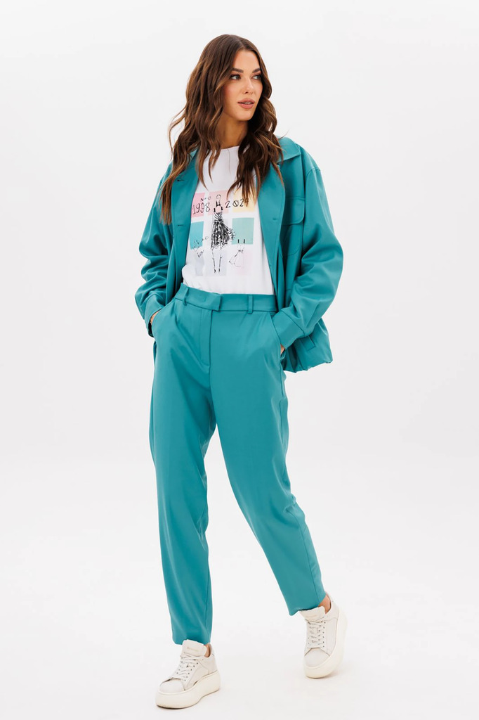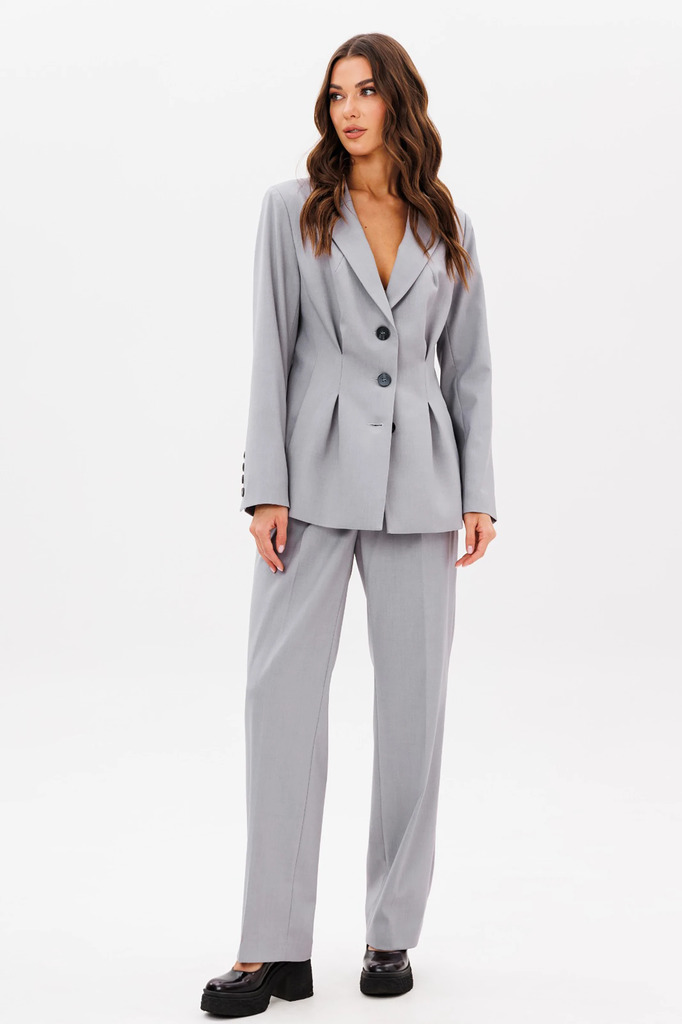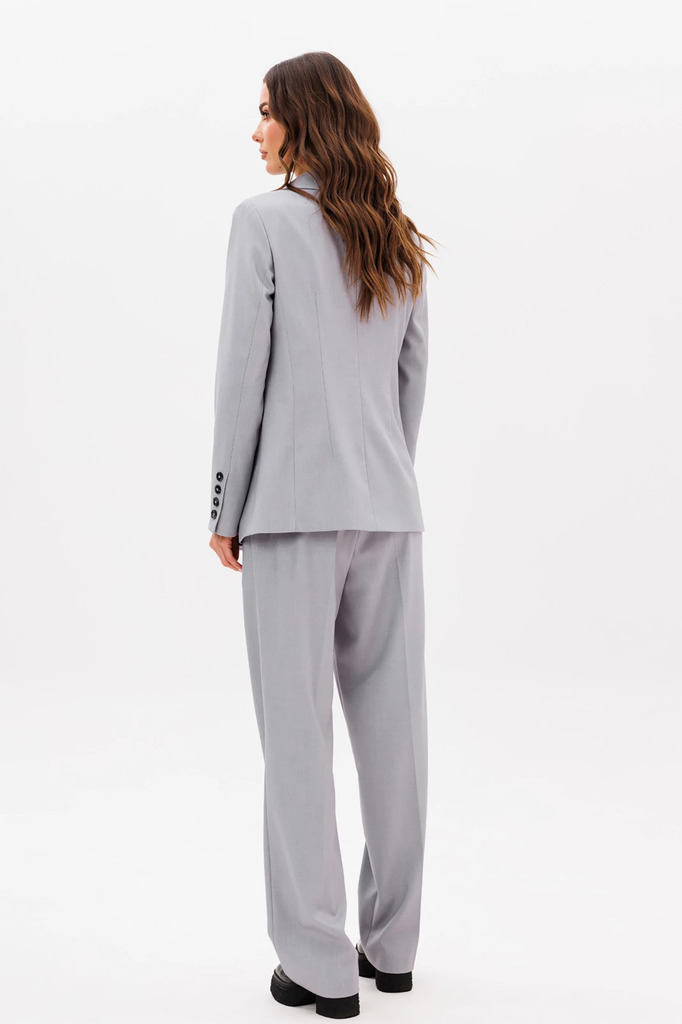 Выбирая стиль кэжуал в одежде, Вы выбираете простоту, понятность и комфорт. Это стиль уверенных, успешных и активных, а его вариативность позволяет создавать из базового комплекта множество современны... Показать описаниех образов.Жакет свободного силуэта, втачного покроя с классическим английским воротником. Полочка с центральной застёжкой, отрезным бочком, нагрудной вытачкой и прорезным карманом с клапаном. Спинка с центральным швом и плечевой вытачкой. Рукав двухшовный с отлётной шлицей по локтевому шву.Брюки классические со стрелками в мужском стиле. По передним половинкам мягкая складка и боковой наклонный карман, по задним - прорезные листочки. Пояс с притачными шлёвками, застёгивающийся на потайные крючки.Длина жакета около 70 см, длина рукава около 60 см. Длина брюк около 104 см ПЭ 64%, вискоза 34%, спандекс 2%.