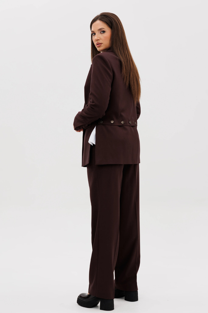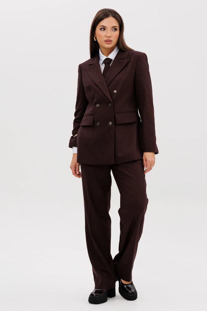 Креативные девушки наверняка по достоинству оценят модель оригинального покроя, выделяющуюся из линейки предлагаемых брючных костюмов, который выполнен в самом модном цвете осени и отлично подойдет дл... Показать описаниея стрит-стайл лука, обращая на себя внимание выразительностью и интригой. Полуприлегающий силуэт, втачной покрой, линия плеча слегка расширена, застежка двубортная, воротник английский с заостренным лацканом. Полочка с нагрудной вытачкой и прорезным карманом с рамкой и клапаном. Спинка с центральным швом и отстегивающейся нижней частью, рукав двухшовный с отлетной шлицей. По боковым швам отлетные шлицы. Брюки классического покроя, на притачном поясе со шлевками, эластичном в области спинки. Передние половинки с наклонным боковым карманом. Задние-с талиевыми вытачками и прорезными карманами с листочками. Длина жакета около 72 см. Длина рукава около 62 см. Длина брюк около 105 см. ПЭ 64%, вискоза 34%, спандекс 2%