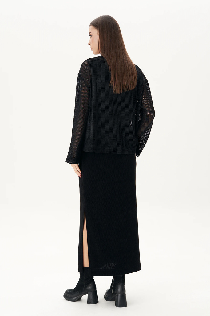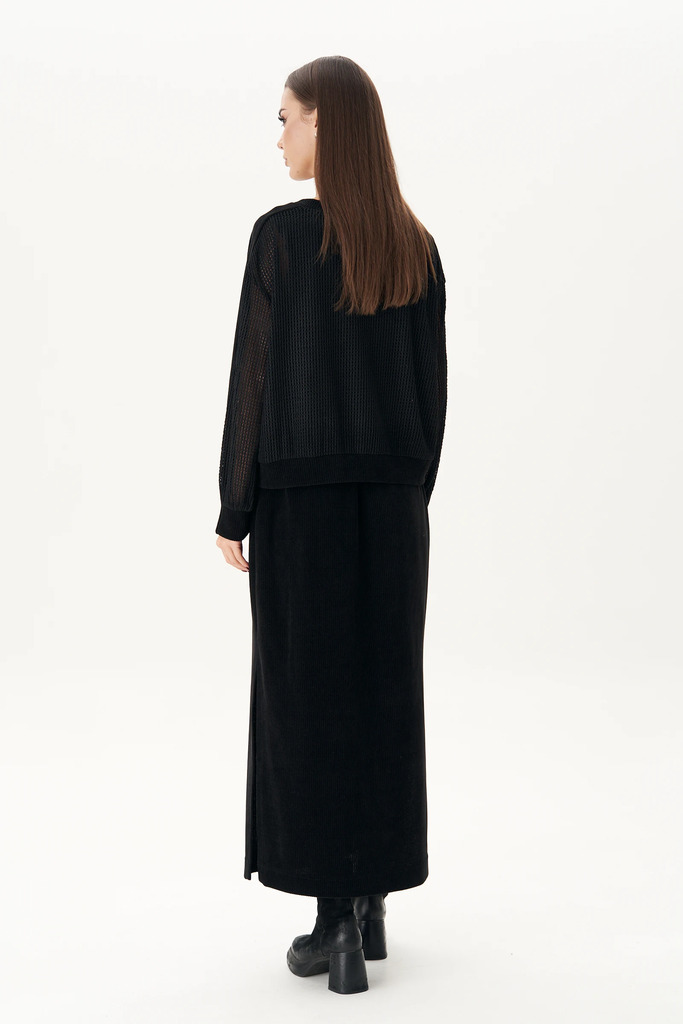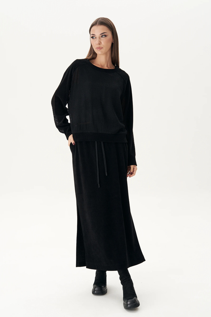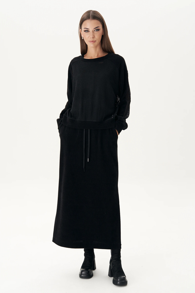 Тренд на готовый костюм с юбкой - идеальное решение для тех, кто не хочет отказываться от мягкости и уюта трикотажного полотна, а также сохраняет своё время. Такой комплект создаёт максимально тёплый,... Показать описание элегантный и одновременно стильный образ. Юбка макси, прямая на притачном эластичном поясе с люверсами и отделочным шнуром в кулисе, наклонными боковыми карманами и разрезом сбоку, из текстильного трикотажного полотна эффекта вельвет. Джемпер свободный, из трикотажной фактурной сетки с металлическим напылением и отделкой из текстурного трикотажа. Покрой свободный с заниженной линией плеча. Рукав с отрезной манжетой и цельнокроеным лампасом, переходящим на полочку и спинку. Манжеты, отрезной пояс низа джемпера и обтачка горловины также из отделочного трикотажа. Современный и стильный кроп-топ подчеркнет вашу модную натуру, создавая актуальный образ. Декоративная строчка добавляет изысканности и оригинальности, делая его уникальным. Длина юбки около 90 см. Длина джемпера около 62 см. Длина рукава с плечом около 74 см. джемпер 20% хлопок, 80% ПЭ. Юбка 90% ПЭ, 6% вискоза, 4% спандекс. Топ: хлопок 95%, спандекс 5%