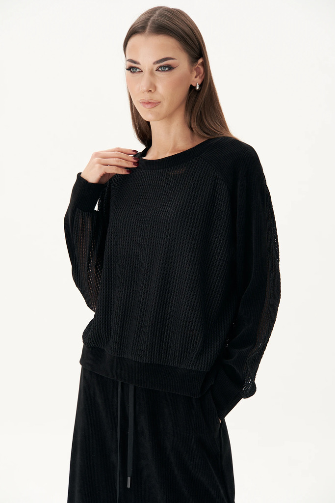 Такой вариант неформального костюма можно отметить отдельно-это настоящий шик, который в любой обстановке смотрится по-особенному. Невероятное ощущение расслабленности и комфорта обеспечивает удобный ... Показать описаниепокрой и тактильно уютный трикотаж с эффектом вельвета. Брюки свободного кроя, прямые, с наклонными боковыми карманами , на эластичном поясе с люверсами и отделочным шнуром. Джемпер рубашечного покроя, свободный, слегка укороченный. Горловина круглая с притачной обтачкой. Рукав рубашечный расширенный к низу. Длина джемпера около 57 см. Длина рукава с плечом около 74 см. Длина брюк около 105 см. пэ 90%, вискоза 6%, спандекс 4%