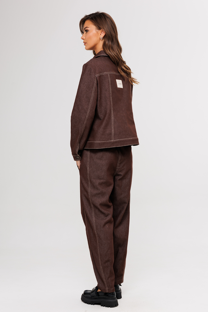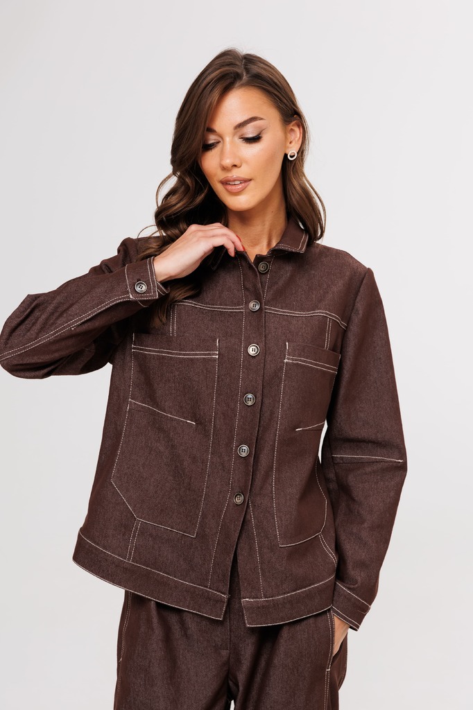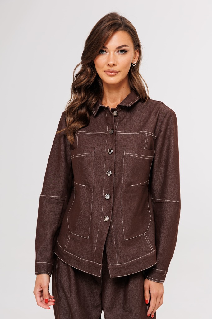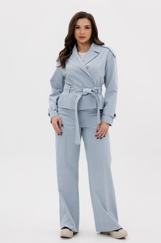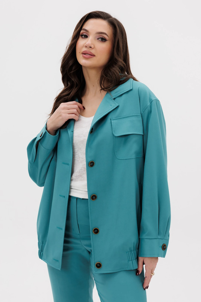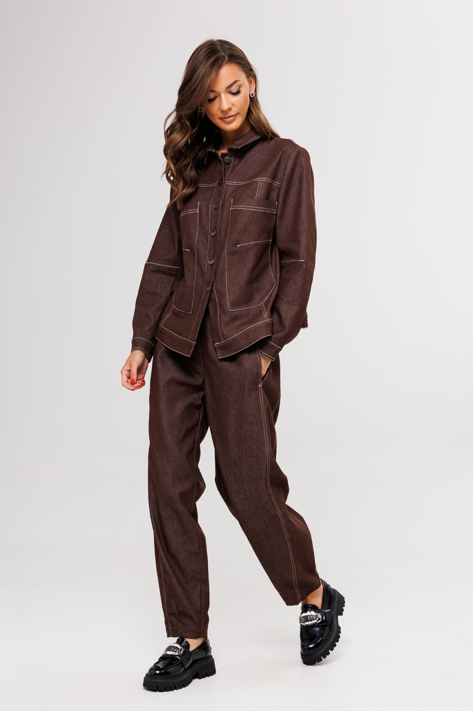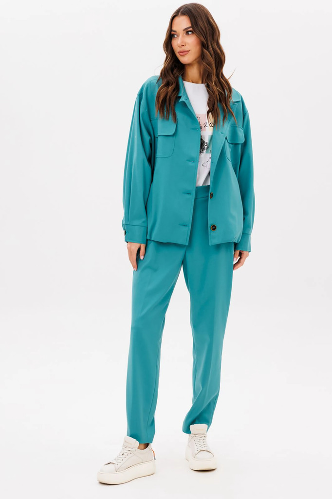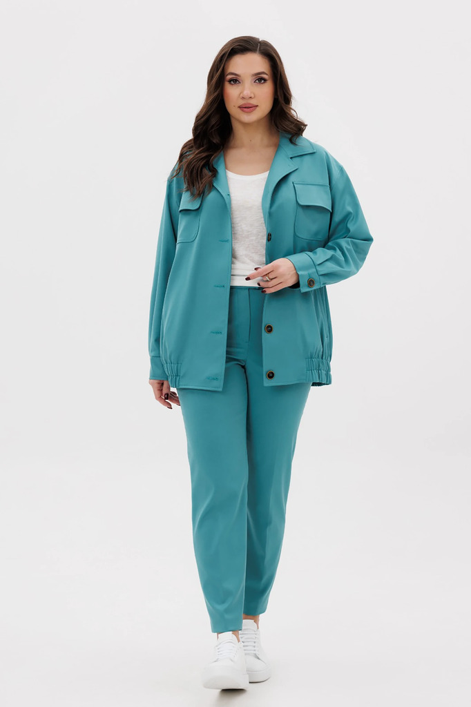 В осеннем сезоне нельзя не отметить трендовость денима. Брючный комплект, нестандартного цвета и кроя-новое прочтение казалось бы уже знакомых нам вещей. Комплект, создающий настроение... Жакет-рубашк... Показать описаниеа полуприлегающего силуэта, втачного покроя с центральной фигурной застежкой на отрезной планке, втачным двухшовным рукавом на манжете и притачном поясом по низу, создающим слегка расширенную линию, имитирующую легкую баску. Полочка с отрезной кокеткой, вертикальным рельефом и фигурным накладным карманом нестандартной формы. Спинка с отрезной кокеткой и вертикальными рельефами. Брюки в расслабленном стиле, на притачном поясе со шлевками, эластичным в области спинки, с отрезным широким компасом по боковому шву и карманом по передним половинкам. Все швы на изделии выполнены контрастной строчкой. Этот look-это не просто одежда, это способ показать себя этому миру. хлопок 96%, спандекс 4%