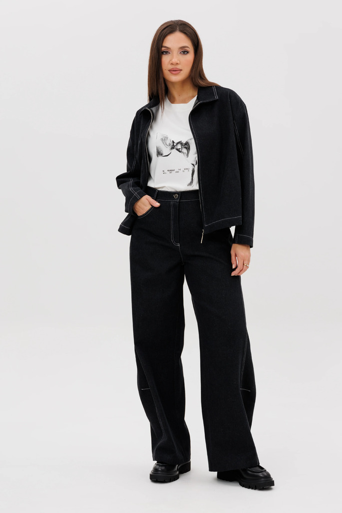 Самой практичной удобной и функциональной женской одеждой по праву считается джинсовый костюм. Этот вариант обеспечивает максимальный комфорт в носке и идеально вписывается в современный образ. Свобод... Показать описаниеная упрямленная куртка-жакет рубашечного покроя с центральной застежкой и стояче-отложным воротником. Из невероятного денима с вареным эффектом и фольгированным накатом. Полочка с накладным карманом. Спинка с отрезной кокеткой и мягкими складкам-защипами. Рукав двухшовный с отрезной манжетой, застегивающейся на петлю и отделочную пуговицу. Брюки "baggy" из гладкокрашеного вареного денима, с интересным худящим эффектом, достигаемым за счет отрезной боковой части, смещенной на передних и задних половинках. Джинсы на отрезном поясе со шлевками, с фигурными карманами по передним половинкам. Задние половинки брюк с отрезной кокеткой и накладными карманами. Боковая часть брюк с отделочными вытачками, придающими легкий объем в области голени. Длина жакета около 64 см. Длина рукава с плечом около 74см. Длина брюк около 106см. хлопок 70%, пэ 27%, эластан 3%