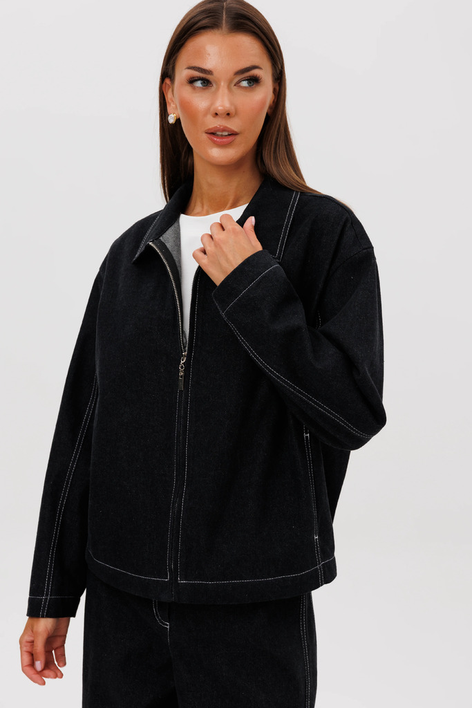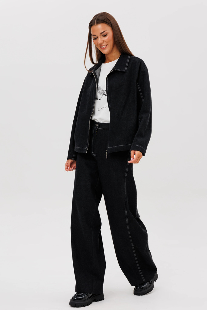"Самой практичной удобной и функциональной женской одеждой по праву считается джинсовый костюм. Этот вариант обеспечивает максимальный комфорт в носке и идеально вписывается в современный образ.  ... Показать описание; Куртка джинсовая, свободного силуэта, рубашечного покроя с втачным воротником и центральной застежкой на тесьму молнию. Полочка с боковым рельефом и карманом в нем. Спинка с уентральным швом и эластичной тесьмой по низу. Рукав двухшовный, с регулирующими кнопками в области локтевого шва. Длина куртки около 56 см. Длина рукава с плечом около 76 см. Брюки "baggy" из денима, с интересным худящим эффектом, достигаемым за счет отрезной боковой части, смещенной на передних и задних половинках. Джинсы на отрезном поясе со шлевками, с фигурными карманами по передним половинкам. Задние половинки брюк с отрезной кокеткой и накладными карманами. Боковая часть брюк с отделочными вытачками, придающими легкий объем в области голени. Длина брюк около 106см." хлопок 96%, спандекс 4%