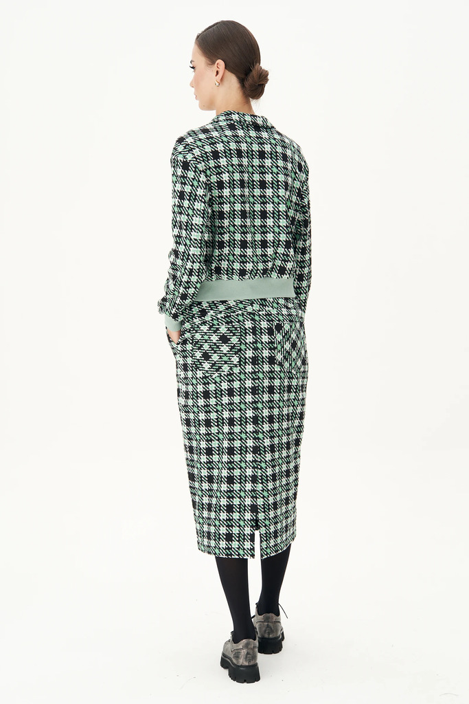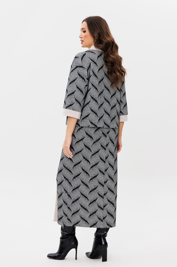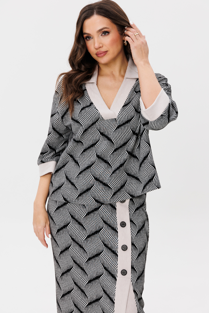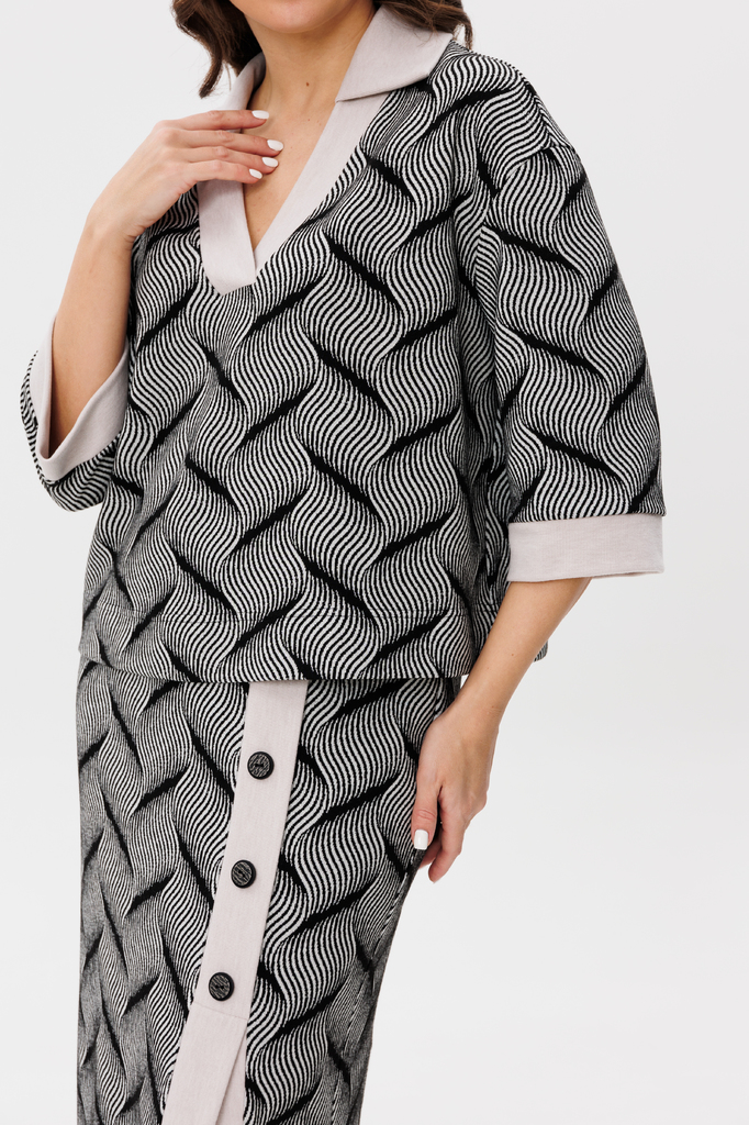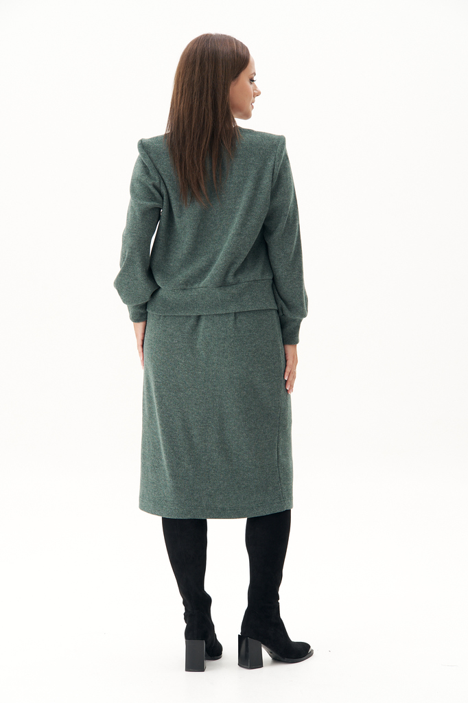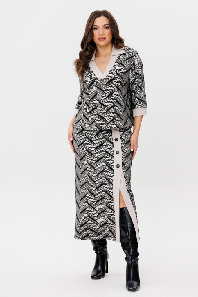 Модный гардероб современной женщины очень разнообразен, но есть ещё много крутых идей, как составить оригинальный уникальный образ. Среди таковых - трикотаж, ведь его легко трансформировать в разнообр... Показать описаниеазные нескучные аутфиты. В качестве базы солирует модный трикотажный комплект с юбкой. Классическая юбка длины миди с молнией в боковом шве и эластичным поясом. Джемпер свободного силуэта, втачного покроя, с центральной застёжкой на притачной планке на петли и пуговицы. По низу джемпера и рукавов - притачные манжеты. Чёткая линия плеча достигается использованием плечевых накладок. Длина юбки около 70 см. Длина джемпер около 54 см. Длина рукава около 60 см. пэ 64%, вискоза 34%, спандекс 2%.