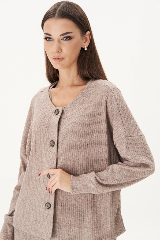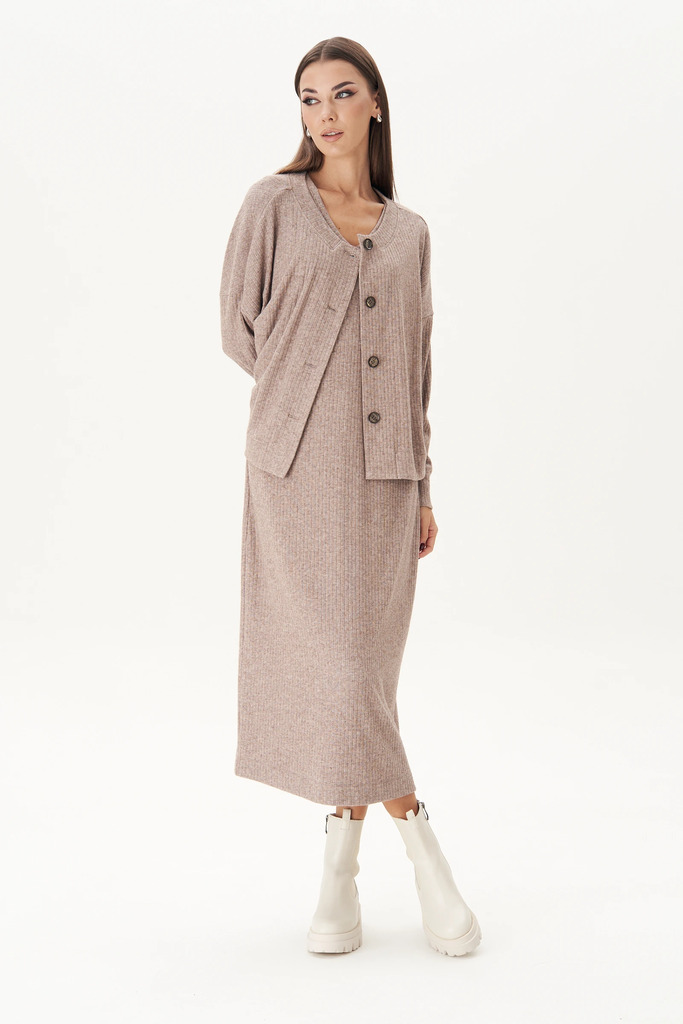 Трикотаж - это не только про зиму: ведь его мы носим круглый год, но именно осенью и зимой он выходит на новый уровень. Такой комплект создаёт трендовые образы без лишних усилий и даёт возможность под... Показать описаниечеркнуть свой стиль. И это - кардиган и платье. Мягкое, уютное трикотажное полотно в рубчик, платье полуприлегающего силуэта, с V-образным вырезом горловины, без рукава. Кардиган средней длины, свободного силуэта, покрой с заниженной линией плеча, рукав - расширенный в области оката на притачной манжете по низу, застёжка центральная на петли и пуговицы. По линии горловины - притачная обтачка, низ изделия - разноуровневый, по боковым швам - разрезы. Длина платья около 115 см. Длина кардигана около 70 см. Длина рукава с плечом около 74 см. вискоза 75%, ПЭ 25%.