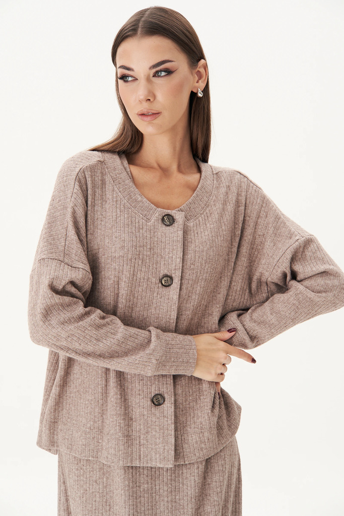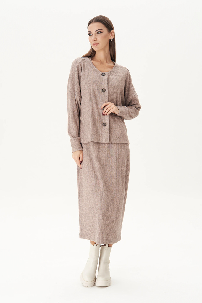 Модный трикотаж стал бесспорным в этом осеннем сезоне. Носить любимые и практичные трикотажные вещи теперь можно смело, не беспокоясь о модных тенденциях, а только соответствуя им. Практичность такого... Показать описание гардероба сложно переоценить, вещи из одного лука можно смело сочетать с другими вещами и при этом выглядеть супер современно. Комплект состоит из джемпера и юбки. Джемпер свободного силуэта с втачным рукавом. Застежка центральная на петли и пуговицы. По линии борта, низу изделия, рукавам и горловине - отделочная эластичная тесьма довяз с легким блеском. Юбка зауженная к низу, на притачном поясе с частично эластичными вставками в области боковых швов. Длина джемпера около 52 см. Длина рукава около 60 см. Длина юбки около 55 см. пэ 64%, вискоза 34%, спандекс 2%/