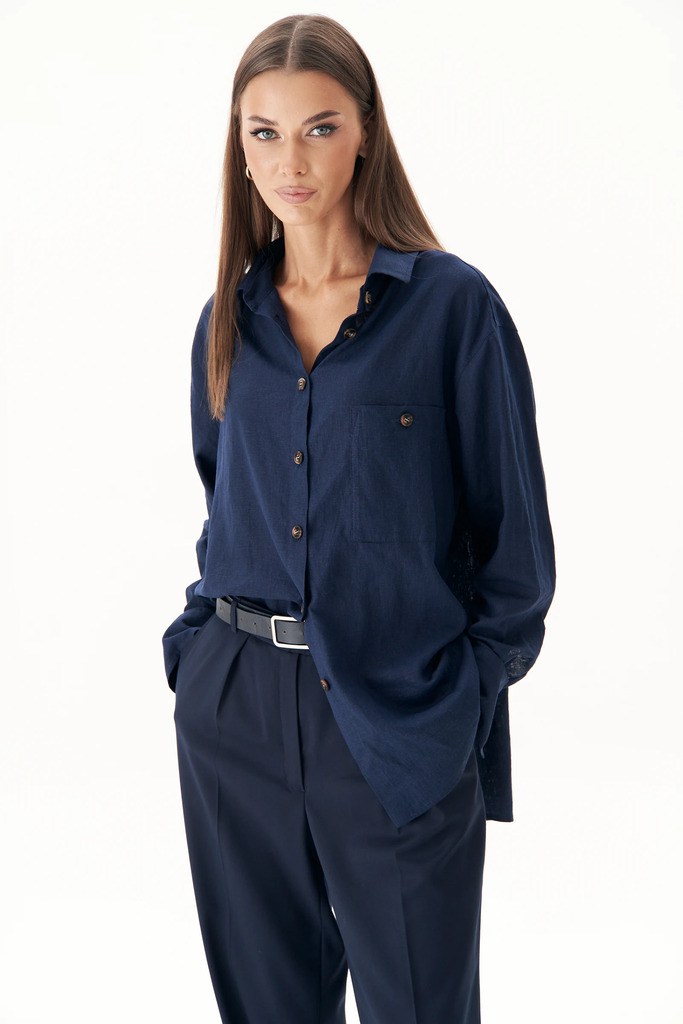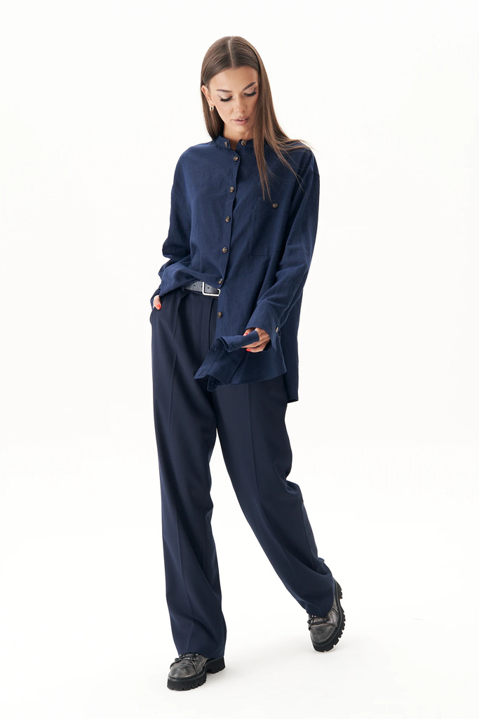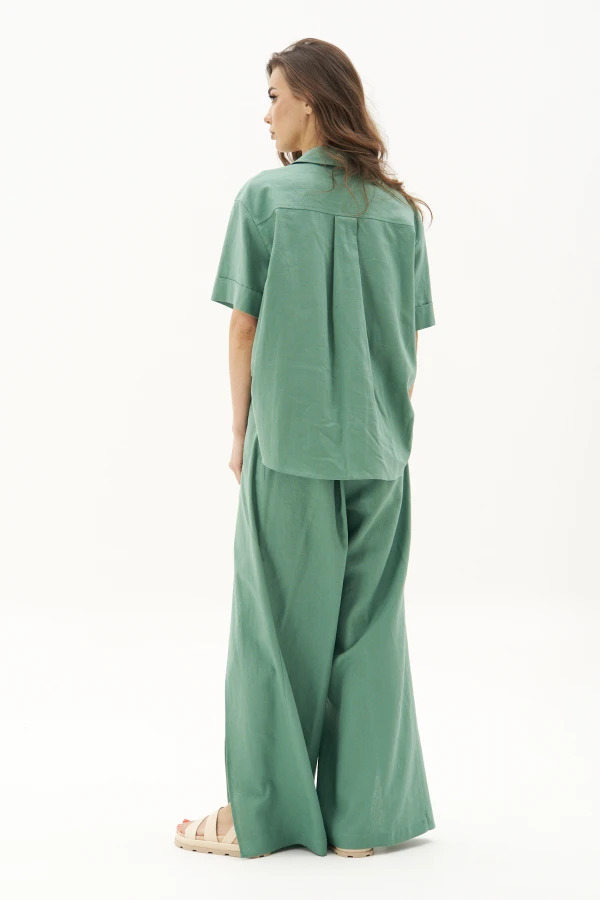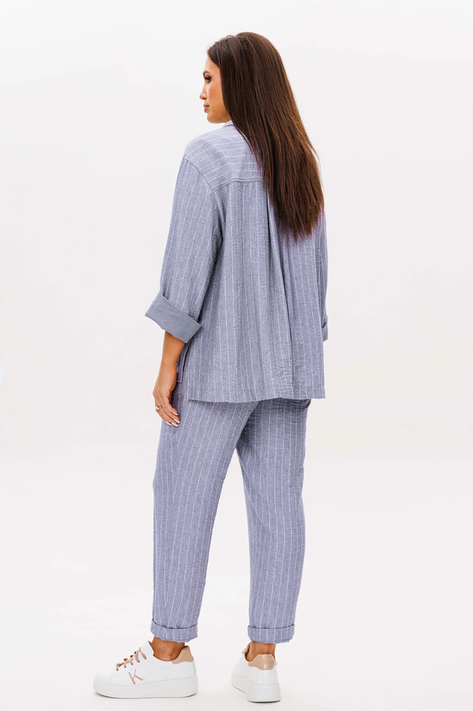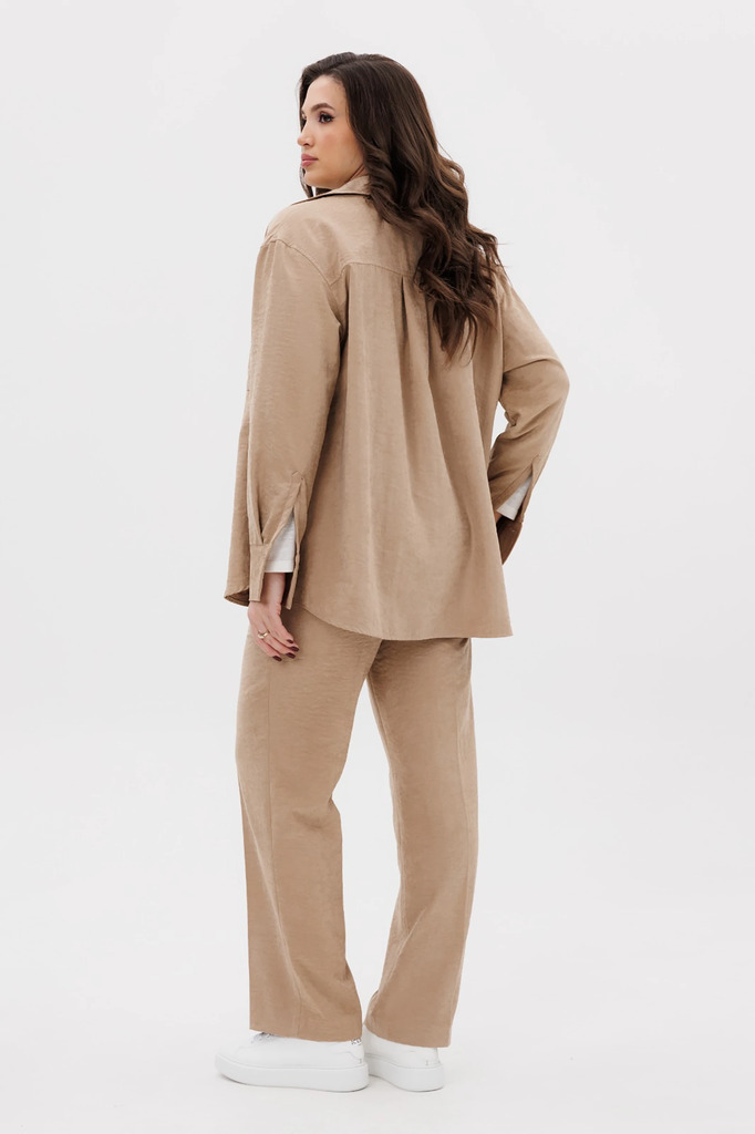 Несмотря на то, что это достаточно выдержанный ансамбль, сочетание льняной рубашки с длинным рукавом и брюк - постоянный выбор трендсеттеров, пленяющих сердца тех, кто старается следить за направления... Показать описаниеми в моде.Свободная классического, рубашечного покроя, с цельной застёжкой, воротником-стойкой и съёмным классическим рубашечным воротником.Полочка с накладным карманом, спинка с отрезной кокеткой и мягкой бантовой складкой. Рукав рубашечный с отрезной манжетой на застёжке.Брюки классические на притачном поясе со шлёвками с наклонными боковыми карманами. По передним половинкам брюк - мягкие складки, по задним половинкам - вытачки и прорезной карман с листочкой.Длина рубашки около 74 см. Длина рукава около 75 см.Длина брюк около 105 см. рубашка: лён 55%, вискоза 45% брюки: пэ 64%, вискоза 34%, спандекс 2%.
