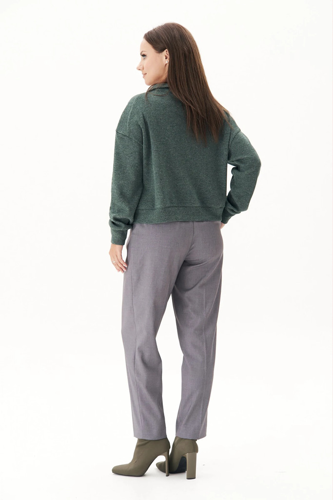 Джемпер из трикотажа. Это одна из базовых вещей осенне-зимнего сезона. Он тёплый, удобный и невероятно комфортный. К тому же, настолько универсален, что его можно стилизовать абсолютно разными способа... Показать описаниеми. Свободный покрой с заниженной линией плеча, рукав рубашечного покроя на отрезной манжете, воротник классический, по центру полочки частичная застёжка-молния. По низу джемпера - отрезной пояс. пэ 64%, вискоза 34%, спандекс 2%.